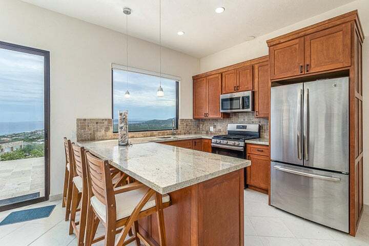En el interior, la casa refleja diseño minimalista y funcionalidad. El plano abierto conecta la sala con la cocina, creando un área central espaciosa y luminosa. La sala es acogedora, con ventanales que enmarcan vistas panorámicas desde casi todos los ángulos. La cocina está equipada con gabinetes de madera, una isla con encimera de granito y electrodomésticos de acero inoxidable, proporcionando un espacio funcional y elegante para preparar comidas.