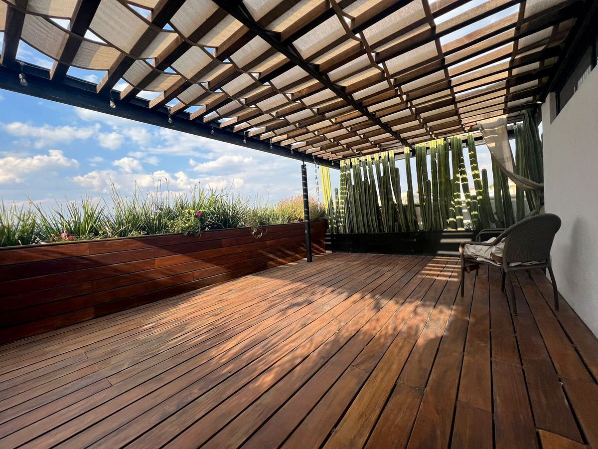 Cuenta con cocina equipada, family room, con vistas al jardin, sala, comedor, tres recámaras, la principal con baño y vestidor, las otras dos comparten baño.. Estudio, sala de tv y baño de visitas. Lavandería cerrada. El roof garden con una terraza y vista espectacular, para disfrutar los atardeceres queretanos. Haz tu cita para conocerla y rentarla.