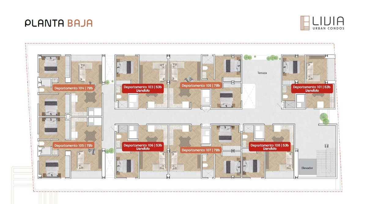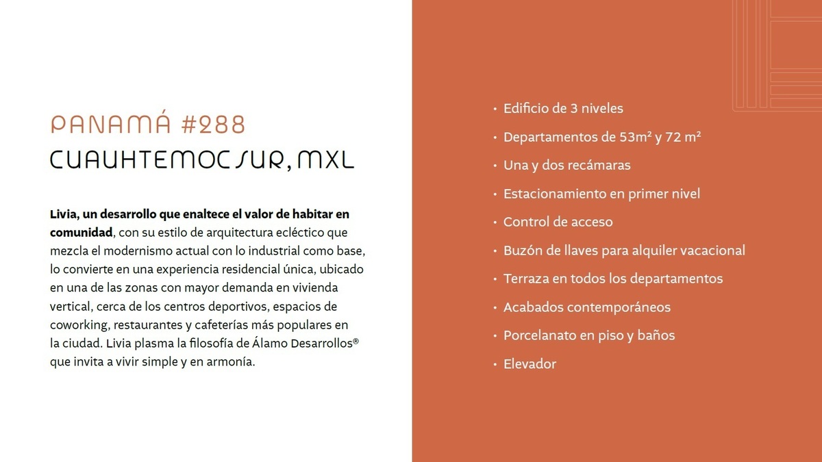 6869 464481LIVIA by Alamo Desarrollos es un proyecto de departamentos tipo condominios actualmente en construcción ubicado en colonia Cuauhtémoc Sur, específicamente en la avenida Panamá 288, entre calle Caracas y Calle Buenos Aires, el proyecto se espera esté terminado en la septiembre del 2026, construido sobre una superficie de 828 m2 y constará de 3 plantas con elevador, la primera será dedicada exclusivamente para estacionamiento y accesos, mientras que en la segunda y tercer planta tendrán cada uno 8 condominios, 4 condominios de 2 recámaras y 4 condominios de 1 recámara; el modelo 72 consta de 72 m2 distribuidos en 2 recámaras, área de cocina, sala/estancia y 1 baño además de que cuenta con 2 espacios de estacionamiento por otra parte el modelo de 1 recámara está AGOTADO (TODOS VENDIDOS) es el modelo 53, que consta de 53 m2 distribuidos en 1 recámara, área de cocina sala/estancia y 1 baño además de que cuenta con 1 espacio de estacionamiento, Cada condominio incluye loseta porcelánica en piso, loseta en área húmeda de baño (regadera), así como escusado, pintura interior y exterior, puertas interiores y exteriores con chapa, ventanas con herrajes de aluminio color negro, instalación eléctrica y plomería básica