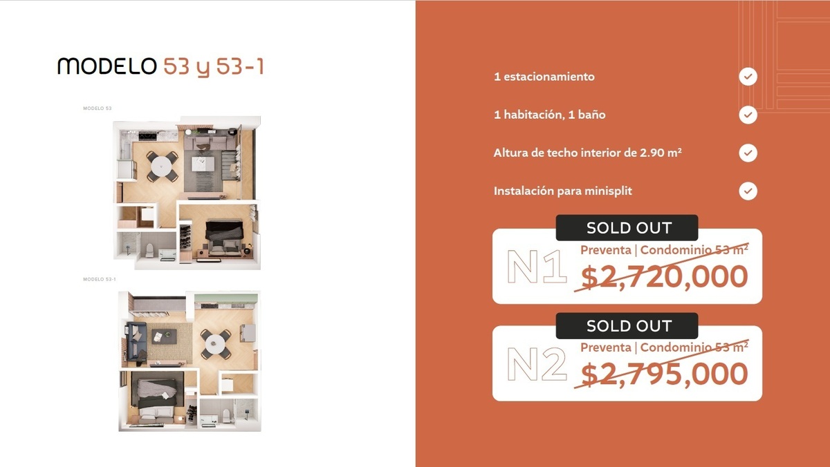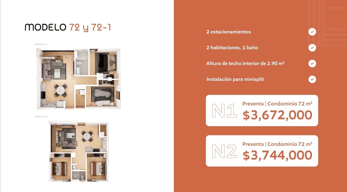 Our pre-sale prices available in August 2025 are model 72 N1 $3,672,000 and N2 $3,744,000 plus deed expenses. Payment can be made in cash or with bank financing.