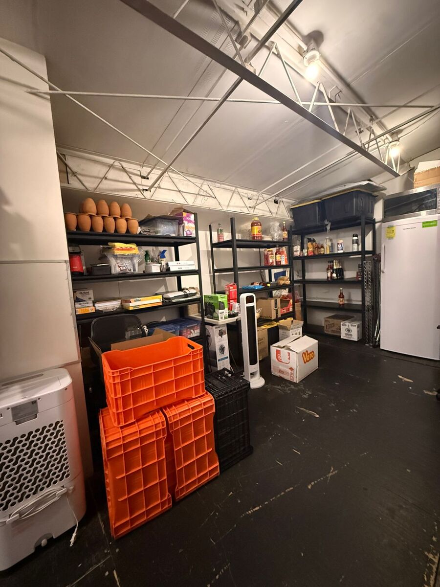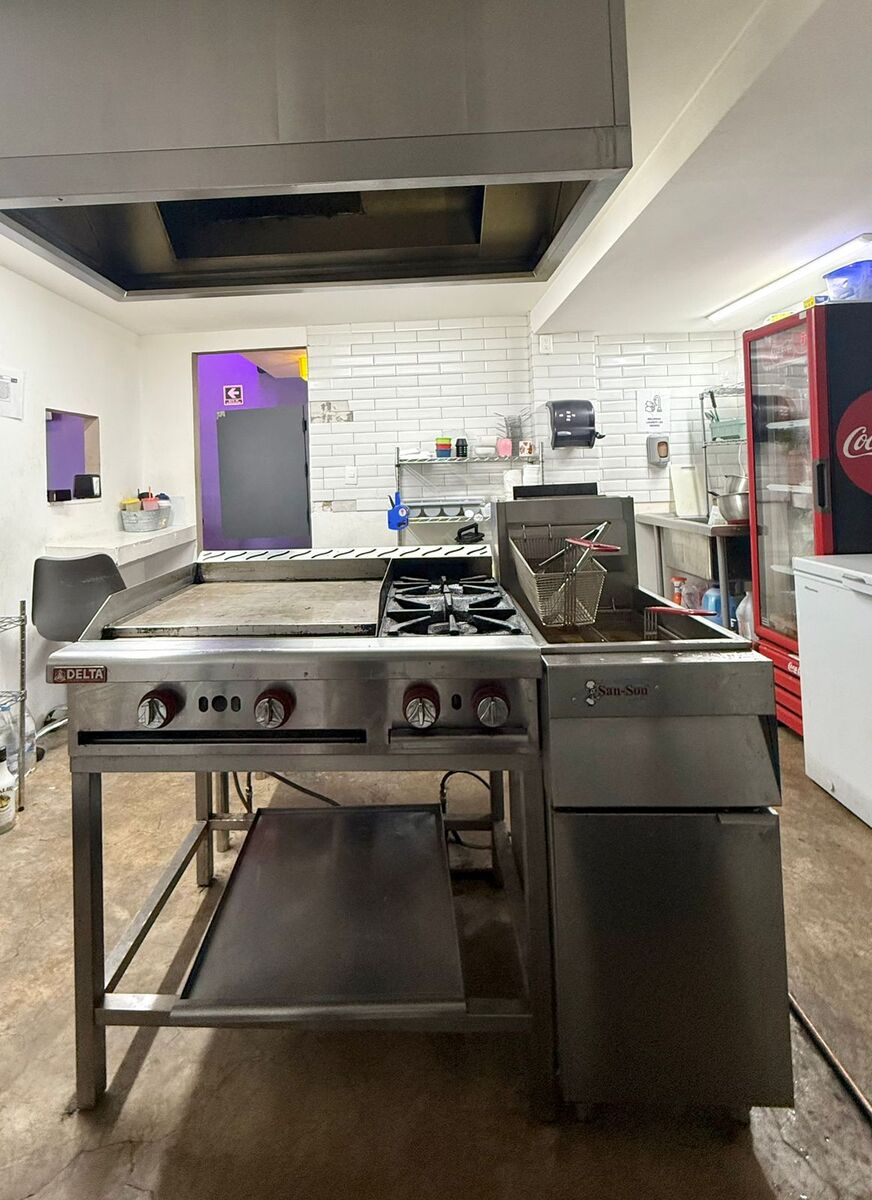 Tiene 2 puertas de acceso, un área para mesas y una barra, un área de aparador y caja, al fondo está la cocina un medio baño, arriba hay un tapanco que pueda funcionar como bodega u oficina.