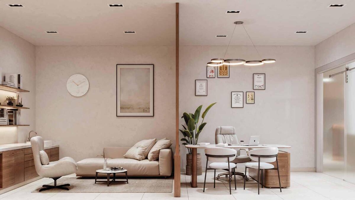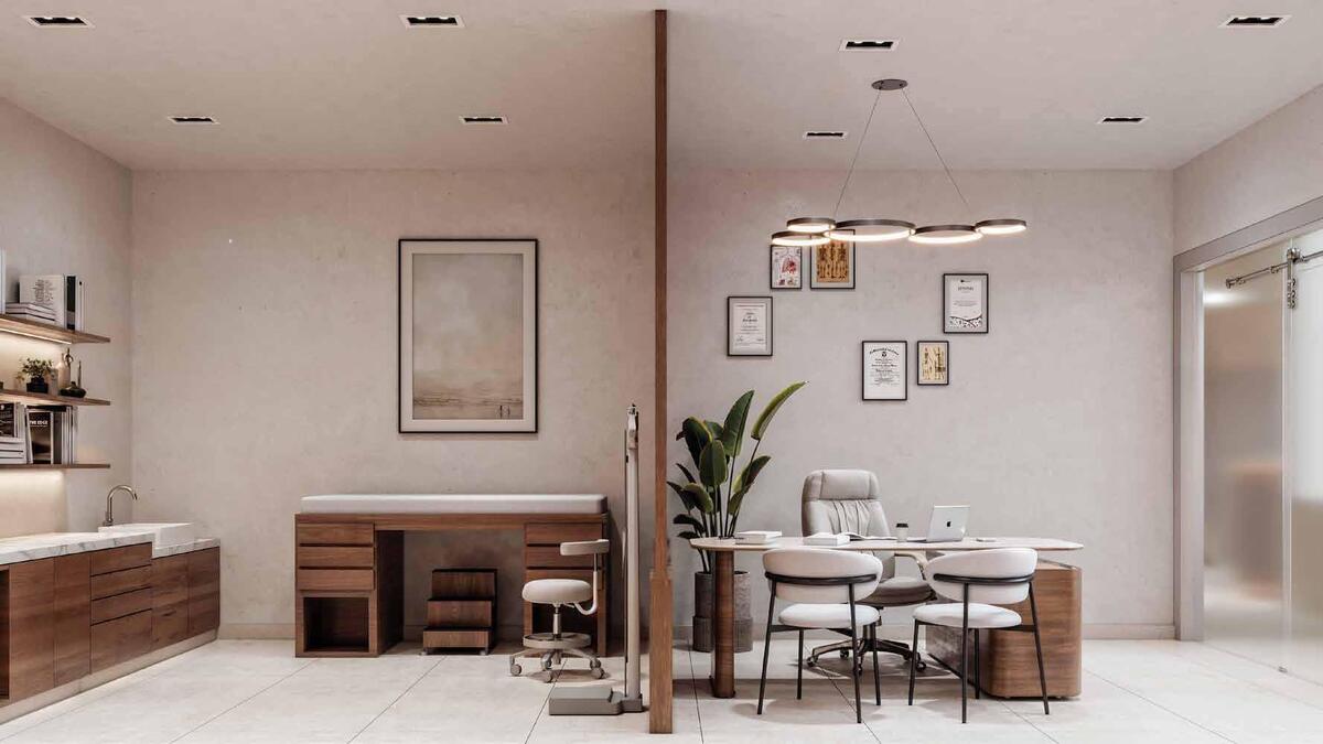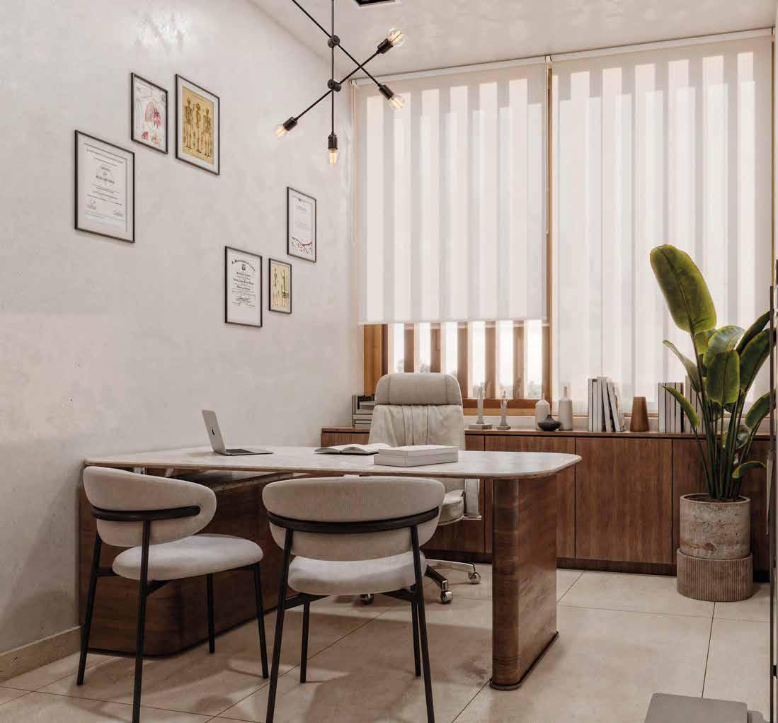 Los consultorios de 9.82 m² a 10.59 m² vienen totalmente equipados con escritorio, repisas e iluminación.