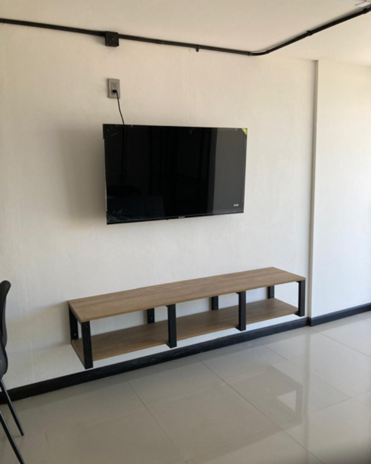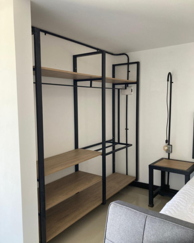 • Amueblado: sofá, mesa de centro, comedor, barra/meseta, estantería/closet abierto, cama con base y colchón, buró.