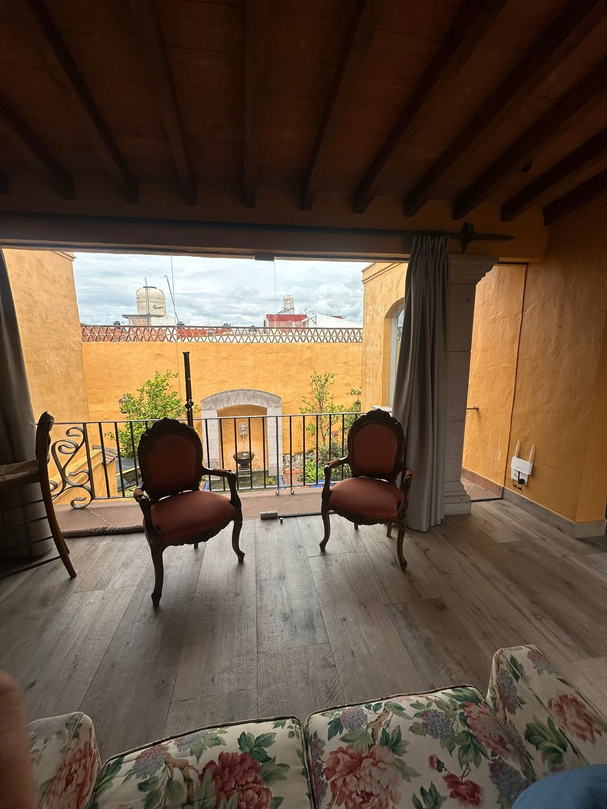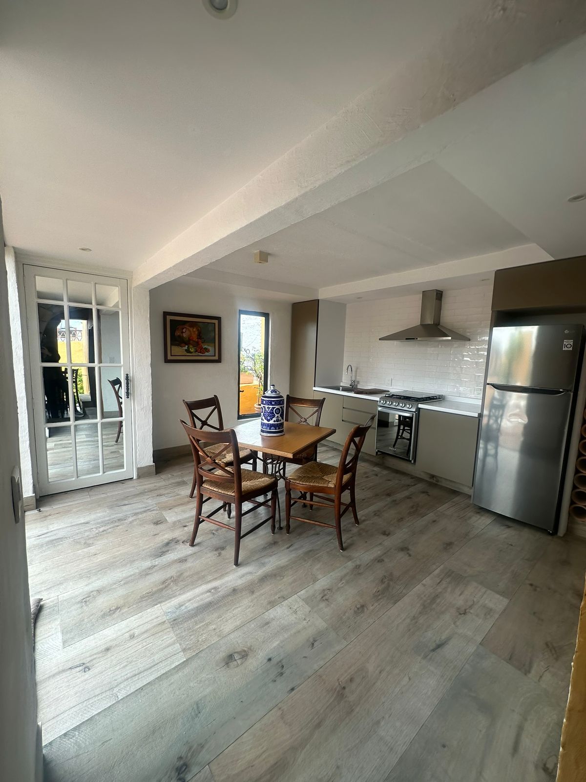 SEMI-FURNISHED LOFT FOR RENT IN THE HISTORICAL CENTER, MORELIA. It has a fully equipped kitchen, living-dining room, 1 bedroom, 1 full bathroom, shared laundry room, and terrace with fire pit. Ideal for a couple.