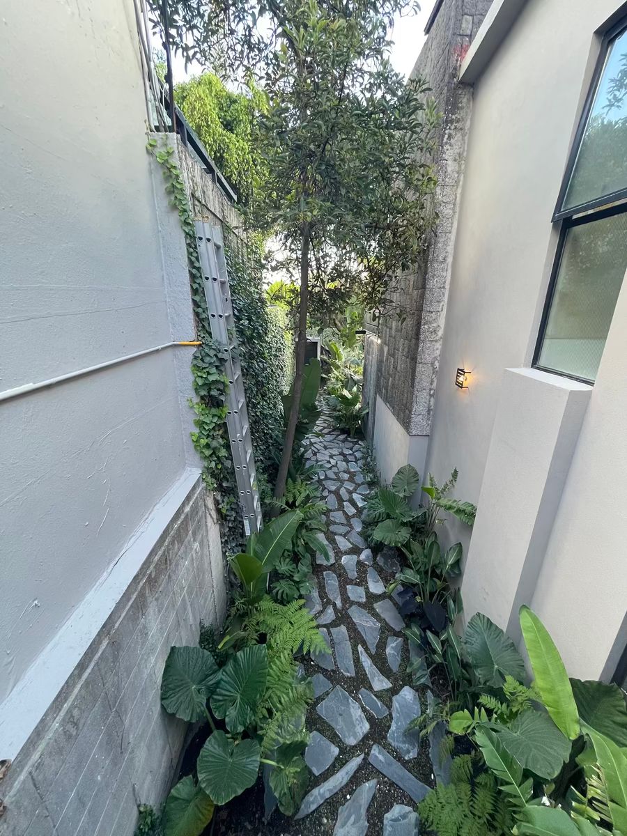 Preciosa entrada llena de plantas, puerta de seguridad.