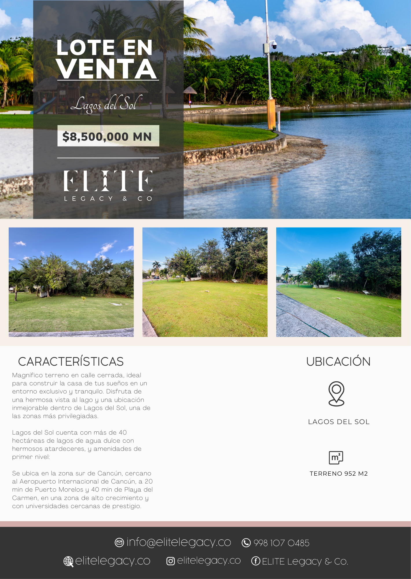 Magnífico terreno en calle cerrada, ideal para construir la casa de tus sueños en un entorno exclusivo y tranquilo. Disfruta de una hermosa vista al lago y una ubicación inmejorable dentro de Lagos del Sol, una de las zonas más privilegiadas.