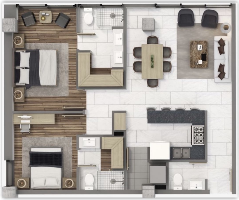 Espacios Comunes: El departamento incluye una sala, comedor y cocina de diseño moderno y funcional. También cuenta con un área de lavado para mayor comodidad.