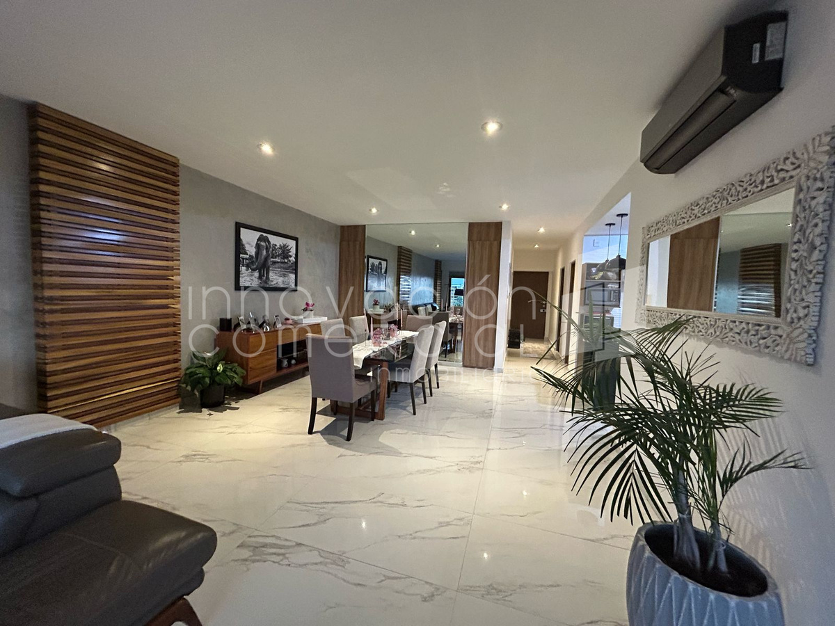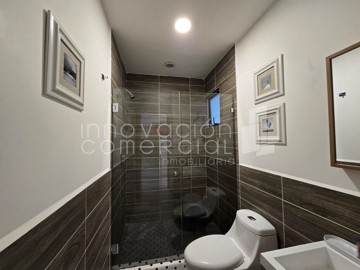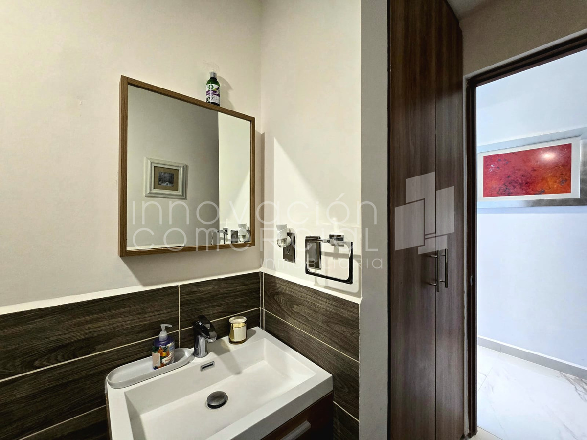 * Área social abierta con espejo gran formato y lambrín decorativo