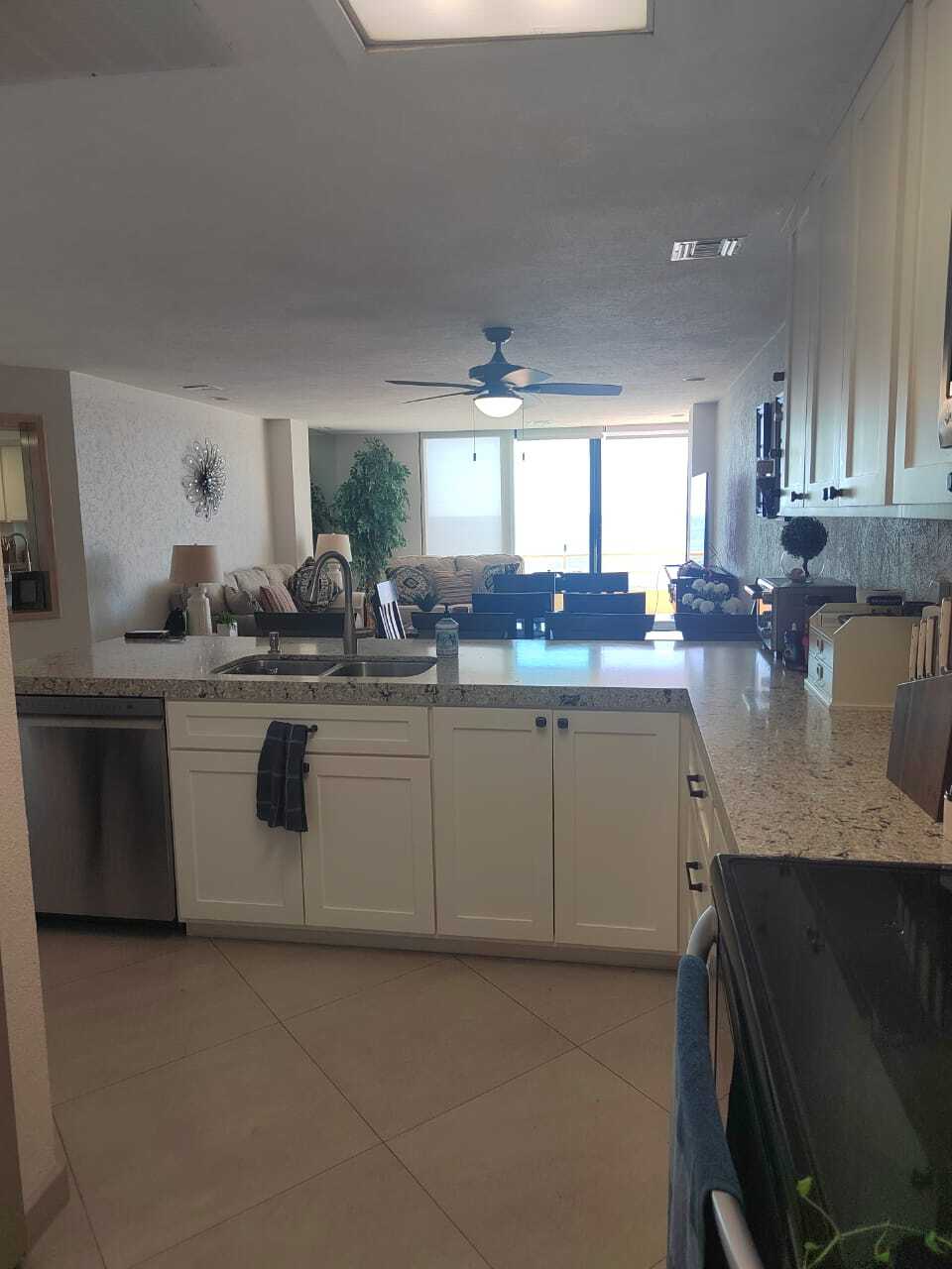 Modern kitchen with quartz countertops, stainless steel appliances, and sensor faucets.