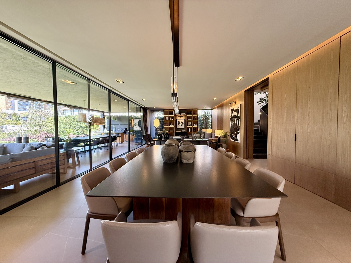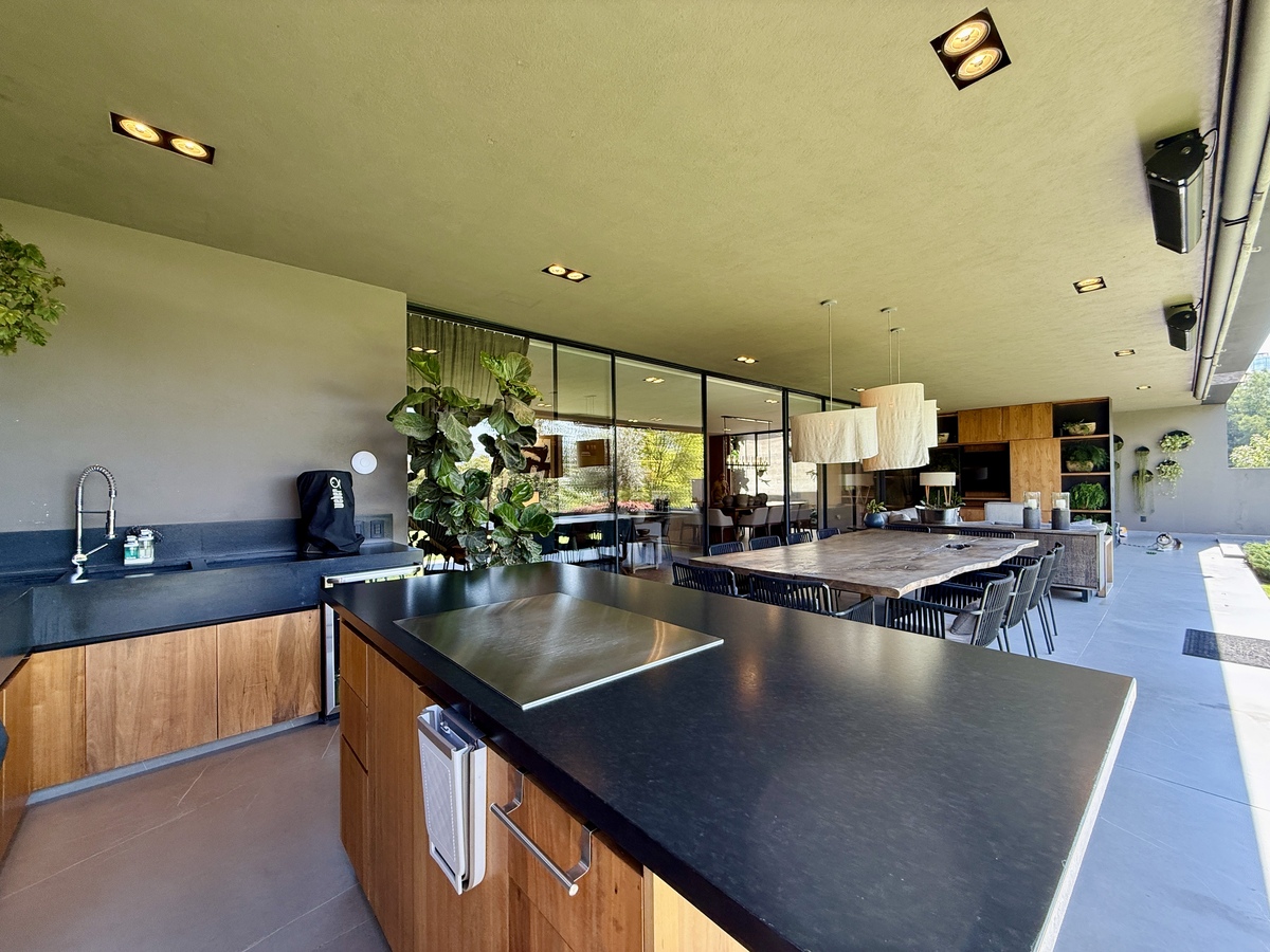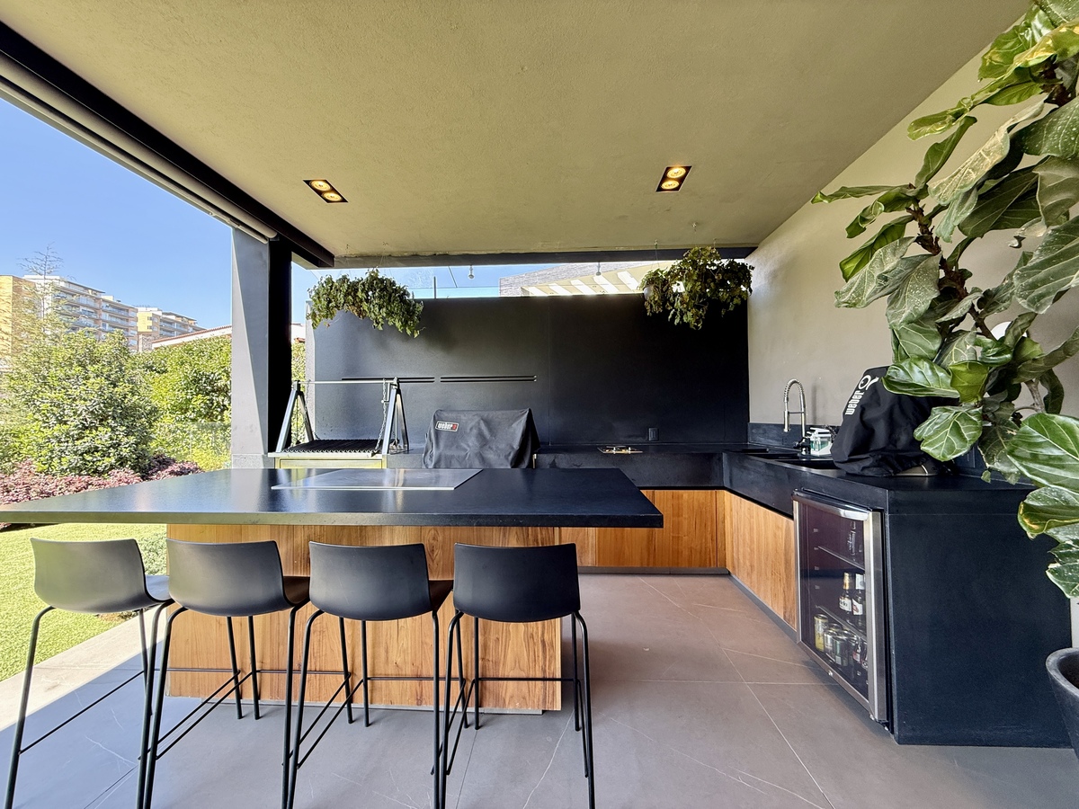 On the first level is the main entrance distributed into; a spacious living room with a fireplace and dining room with a bar, breakfast area, closed kitchen with two pantries, guest bathroom. It has a terrace with a fire pit, bar, grills, teppanyaki grill, and wood and gas oven, from there you have a view and access to its garden as well as access to the pool and jacuzzi. 150 m2 garden with an automated irrigation system.