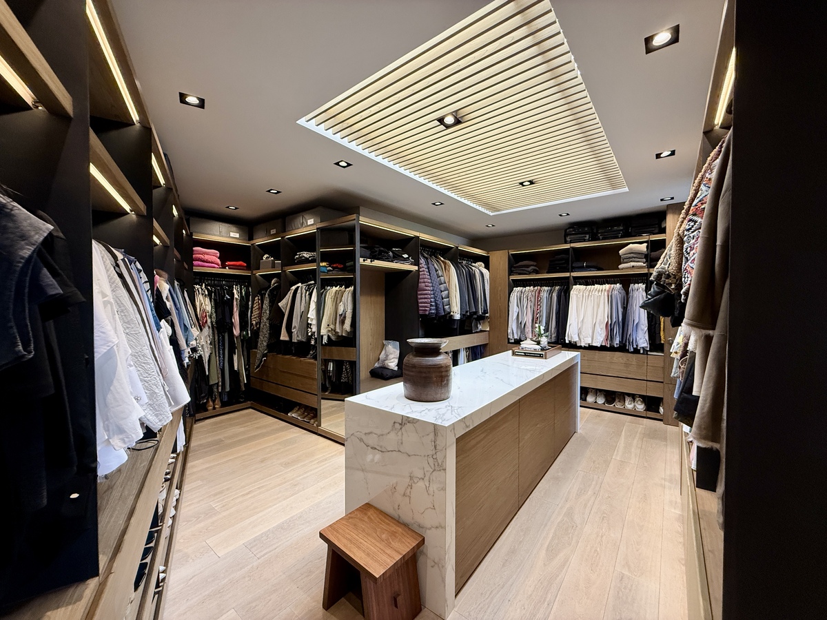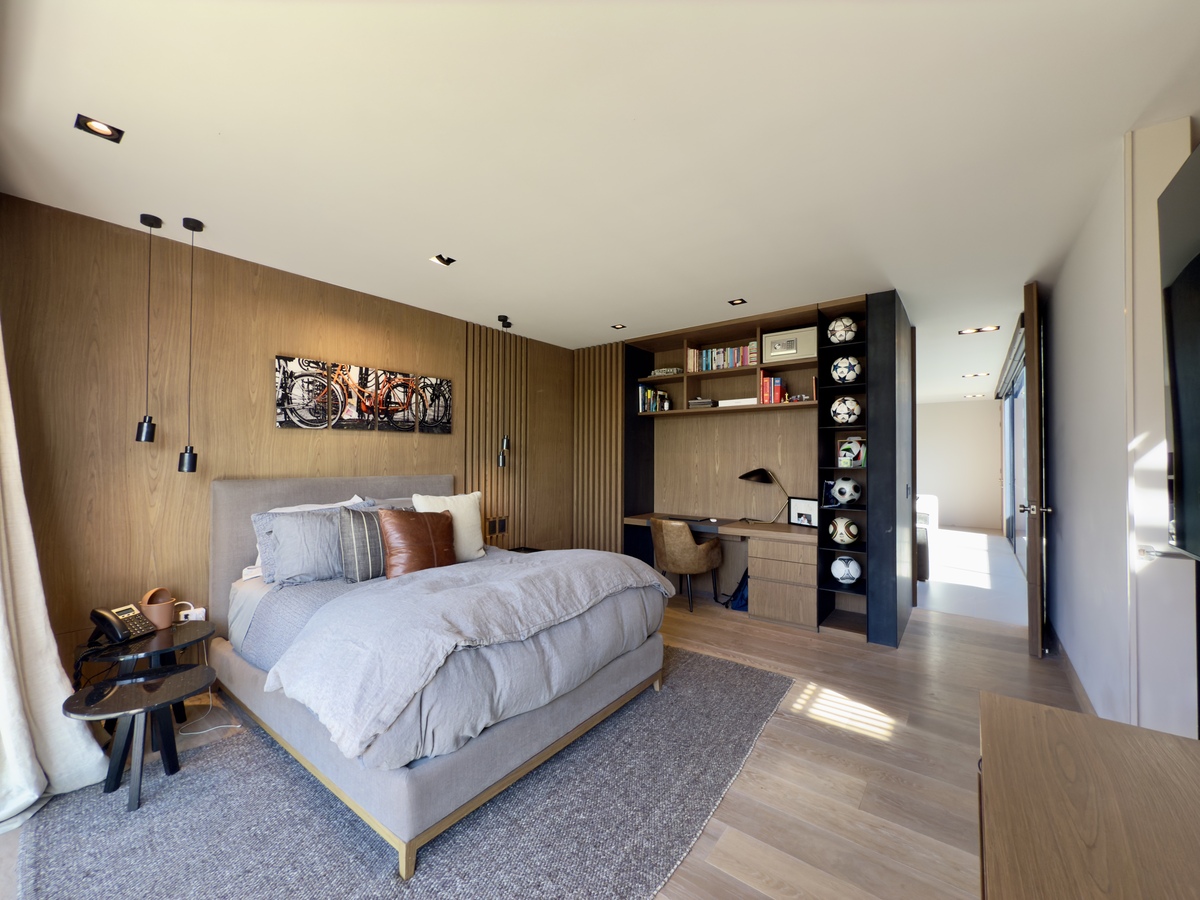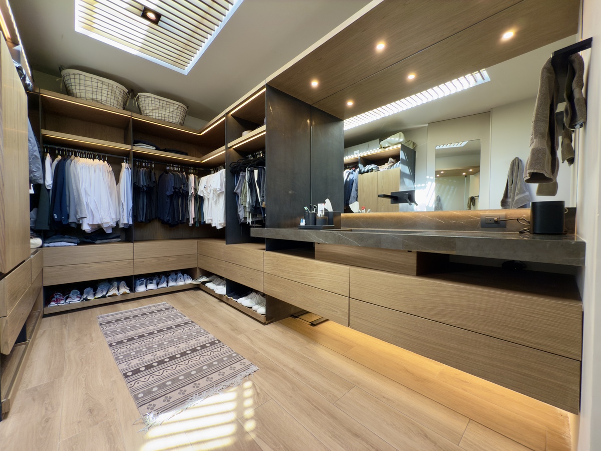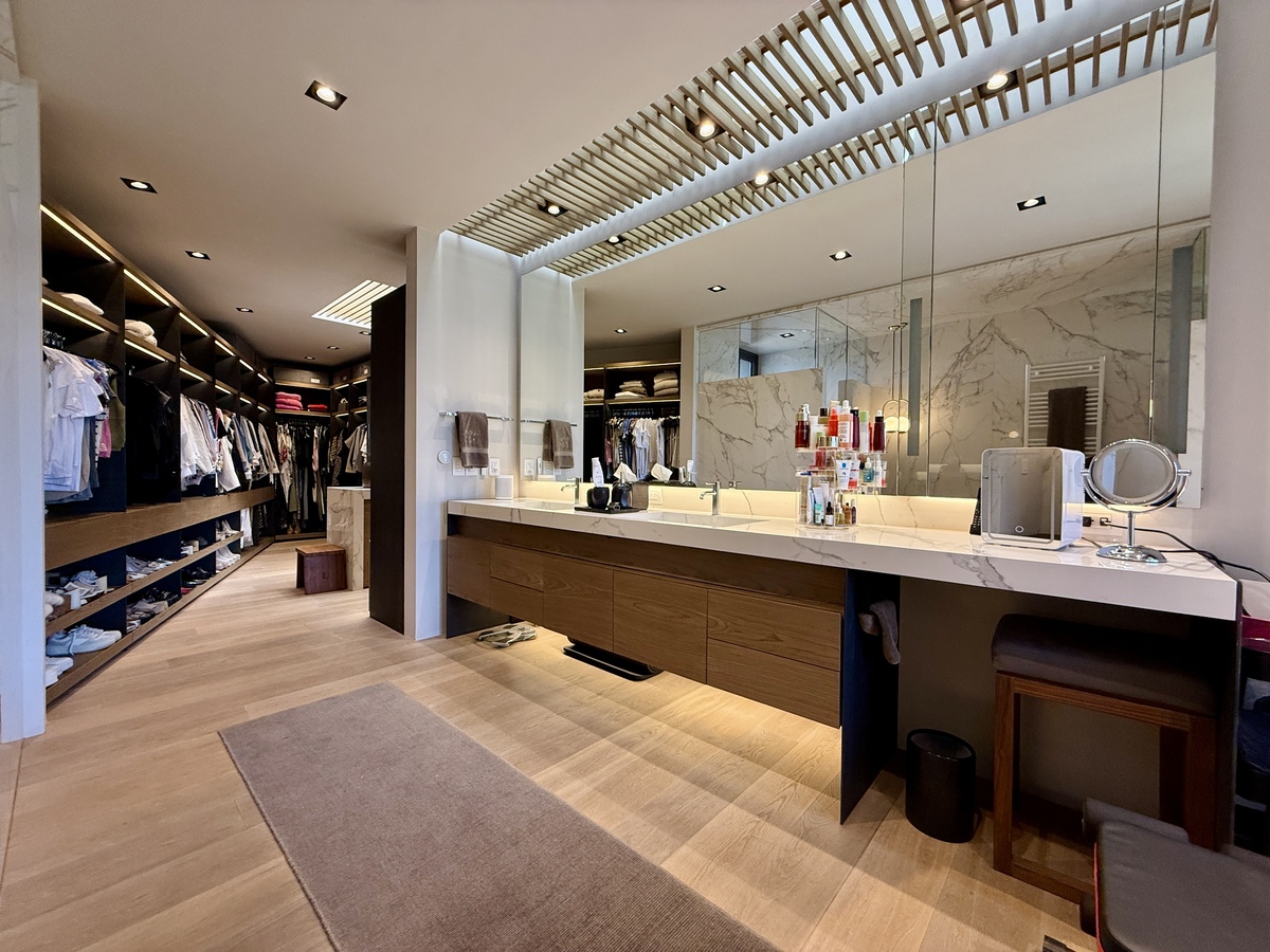 On the second level, we find 4 bedrooms (two of them share a bathroom). All have a dressing room and balcony. The master bedroom has a large dressing room with a skylight and bathroom.