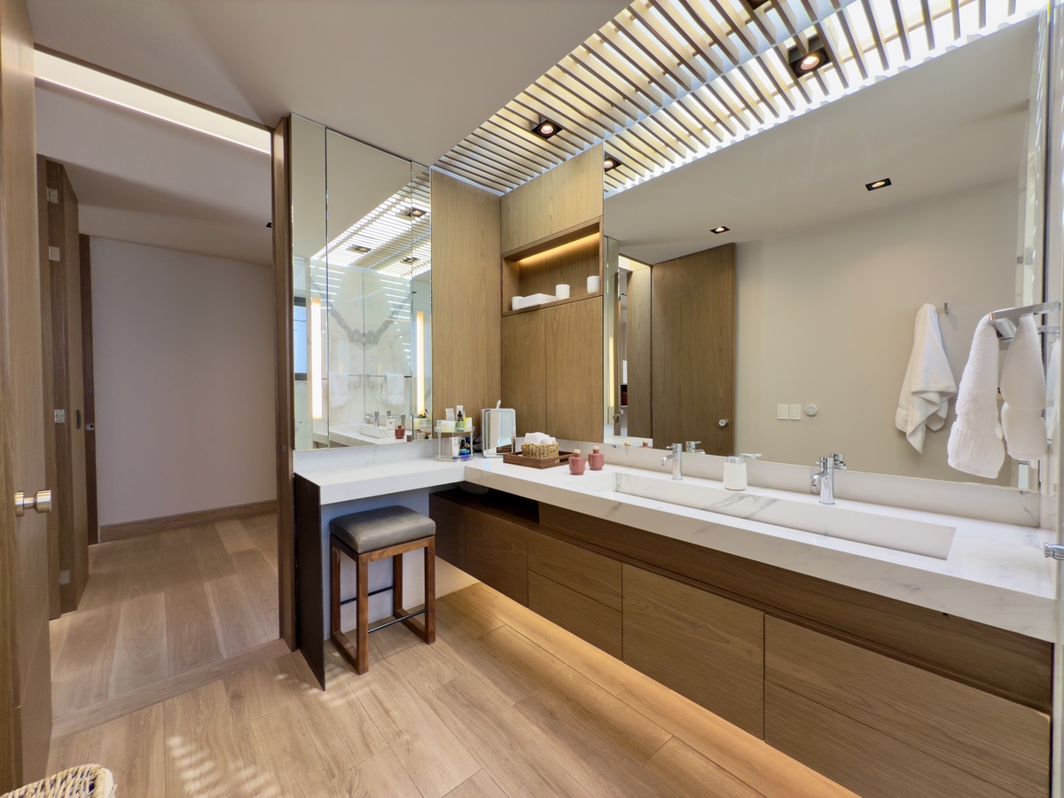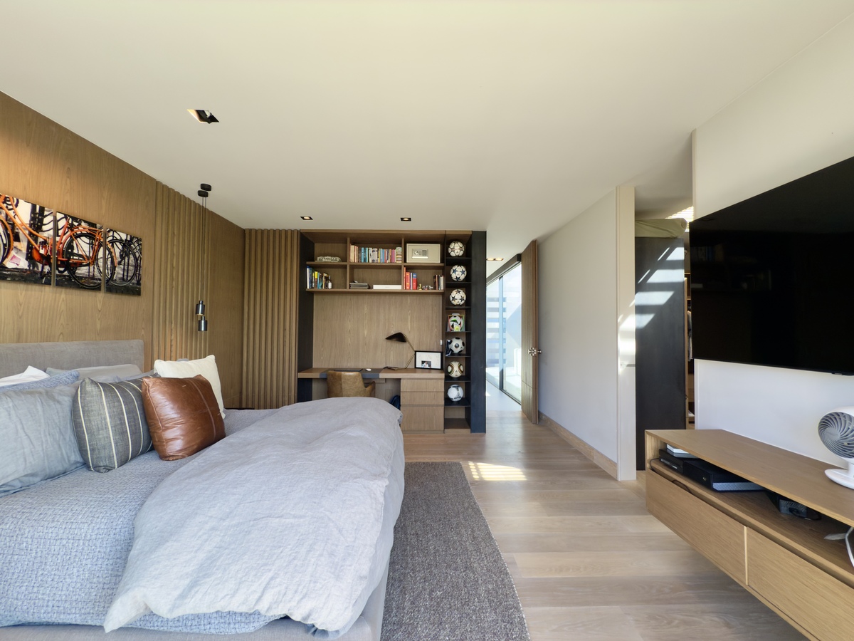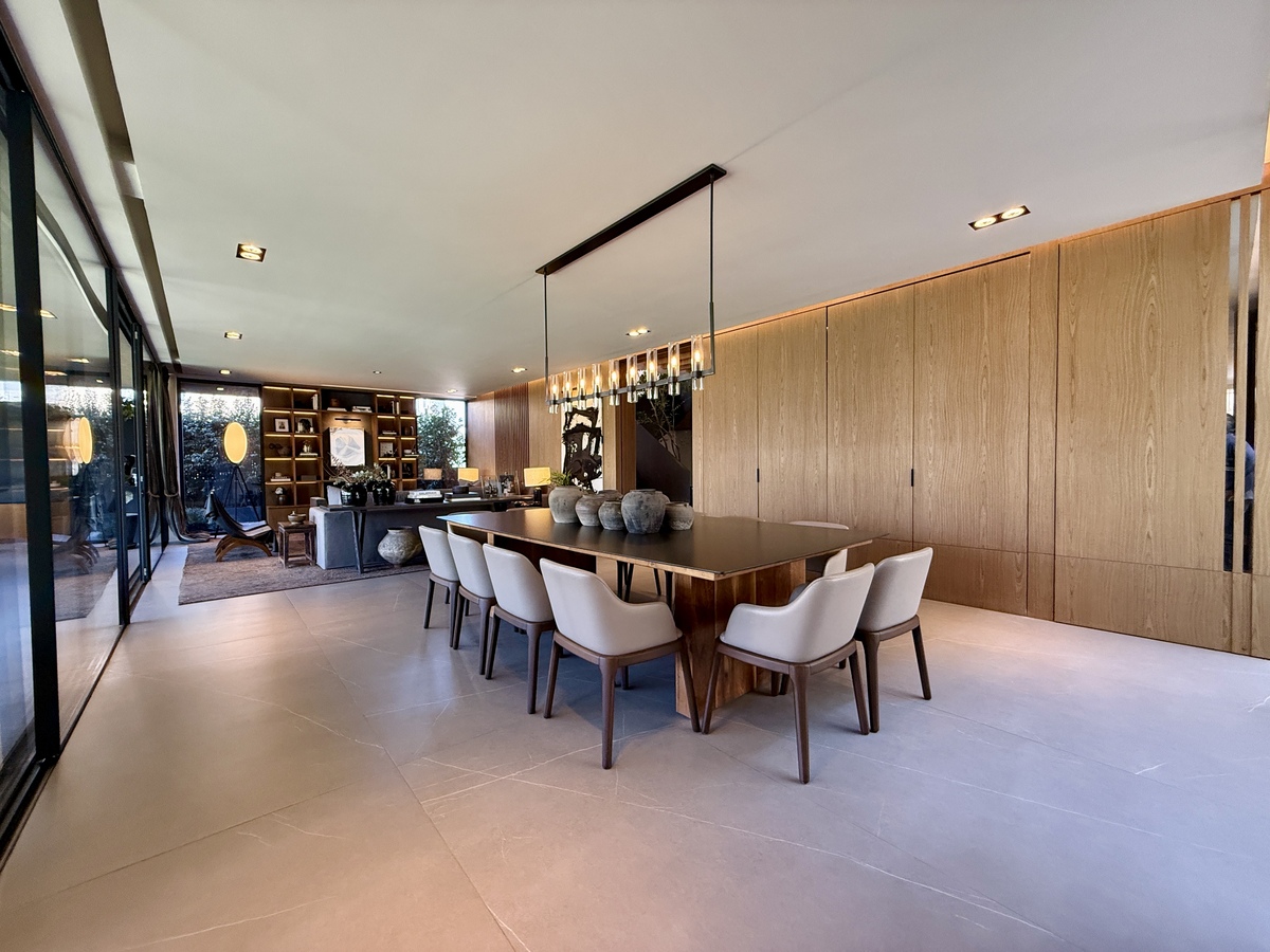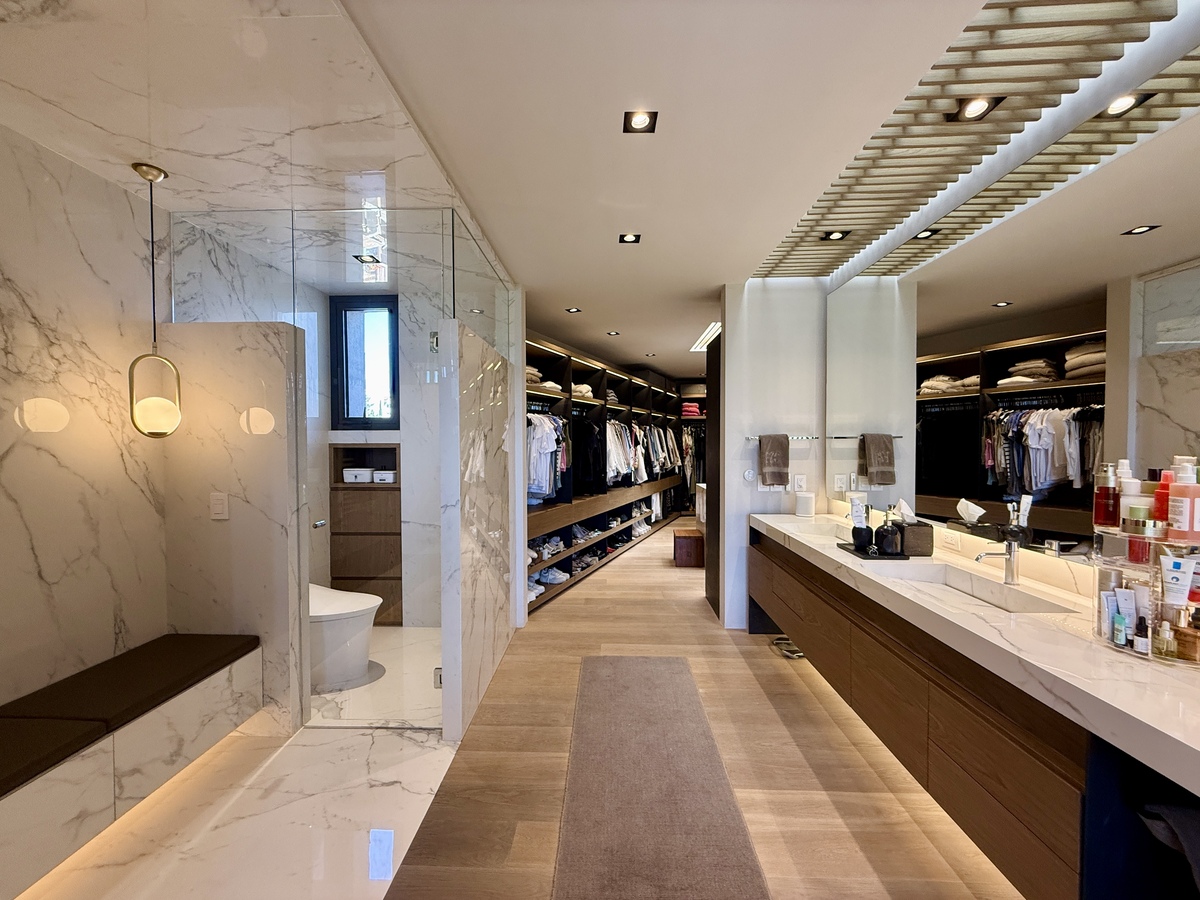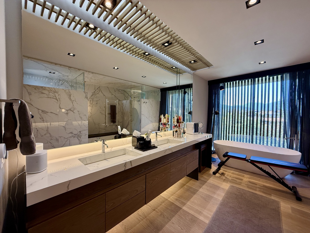 On the second level, we find 4 bedrooms (two of them share a bathroom). All have a dressing room and balcony. The master bedroom has a large dressing room with a skylight and bathroom.