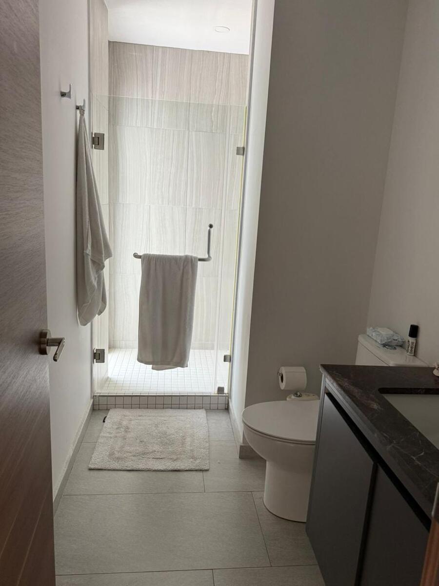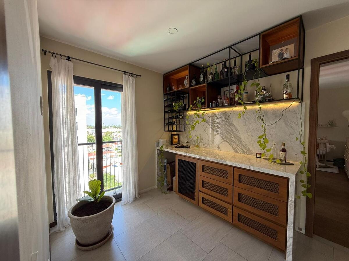 Half bathroom for guests, living room, dining room, integral kitchen with a large granite breakfast bar, two bedrooms with bathroom and closet, large balcony with a view of Av. Paseo de la Estrella, laundry area, and service stairs.-