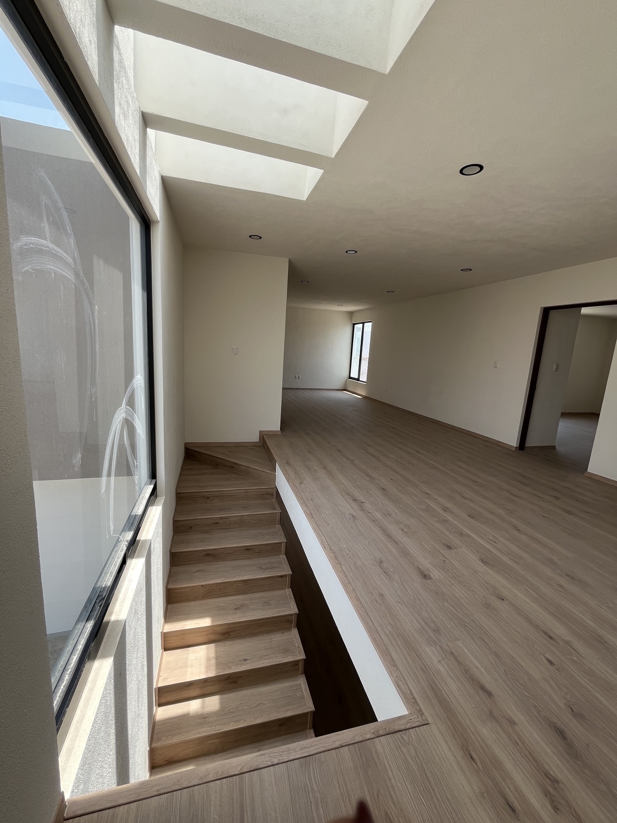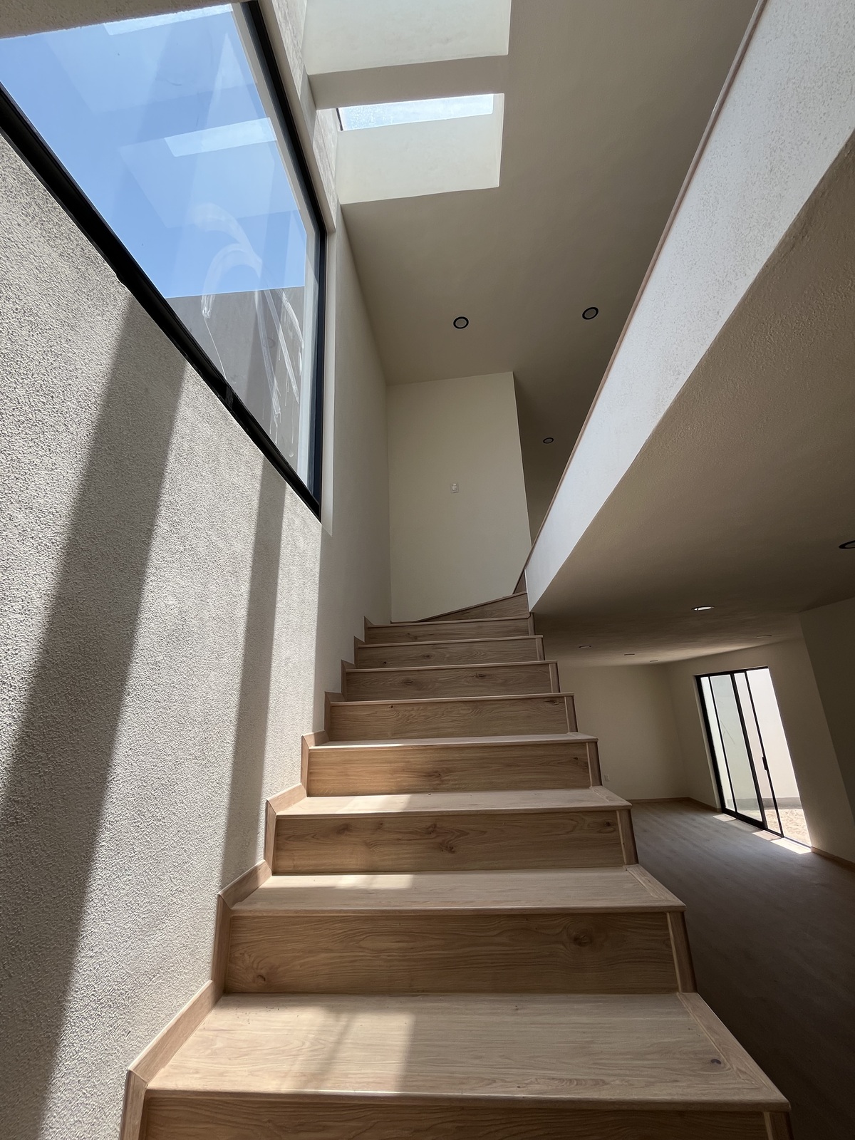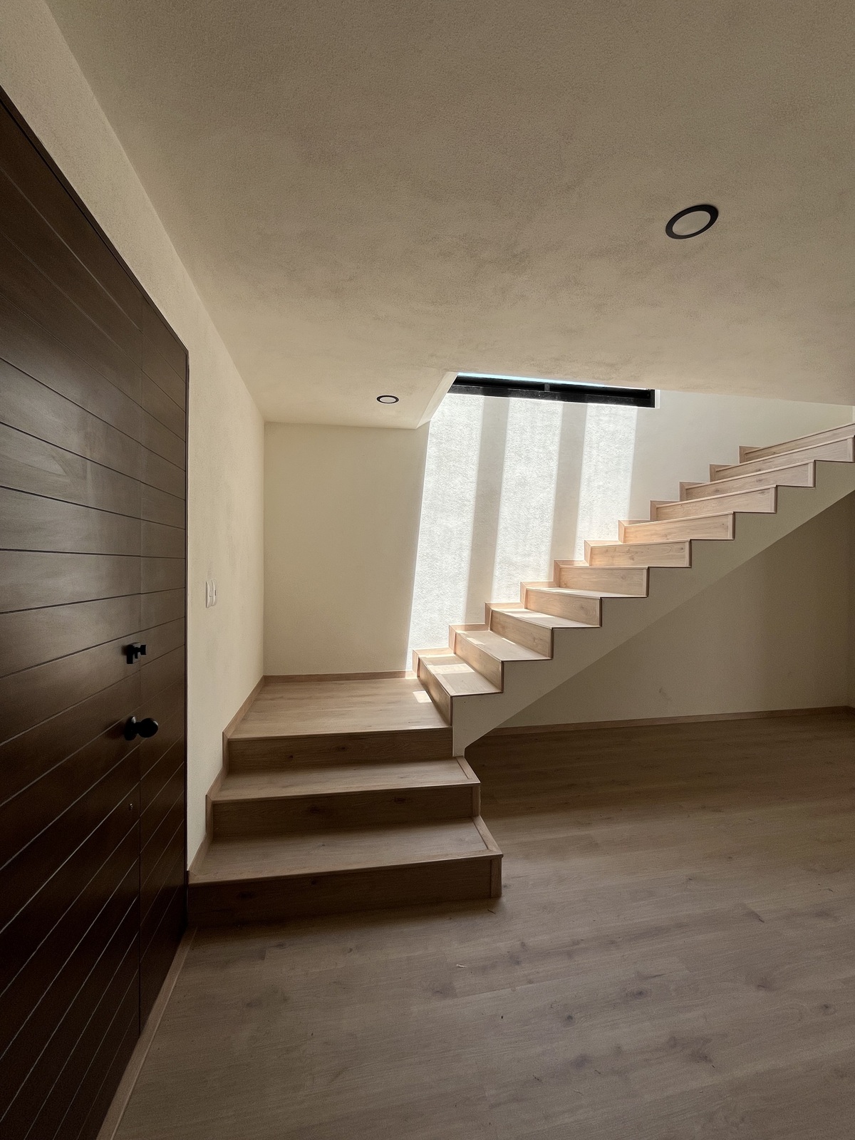 En PB la amplia entrada nos invita a espacios amplios, abiertos, iluminados y armoniosos donde encontramos el espacio perfecto bajo la escalera para una barra, estantes o área de estar y un medio baño. La sala y comedor son maravillosos en cuanto a luz y espacios se refiere. Se integra un jardín que tiene acceso directo a la cocina integral, con gabinetes y barra de gran calidad, así como área de servicio (de lavado y servicio con baño completo), que conecta con el estacionamiento para dos autos.