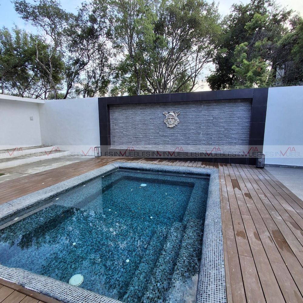 La casa cuenta con un gran jardín exterior de 4000 m2, por el cual pasa un arroyo el cual está enmarcado con un bello puente de madera. Es un verdadero lugar de ensueño que tiene grandes espacios para disfrutar como jacuzzi, alberca, bar exterior, cocina exterior de acero inoxidable, fogatero, cancha de usos multiples, y una gran terraza para eventos.