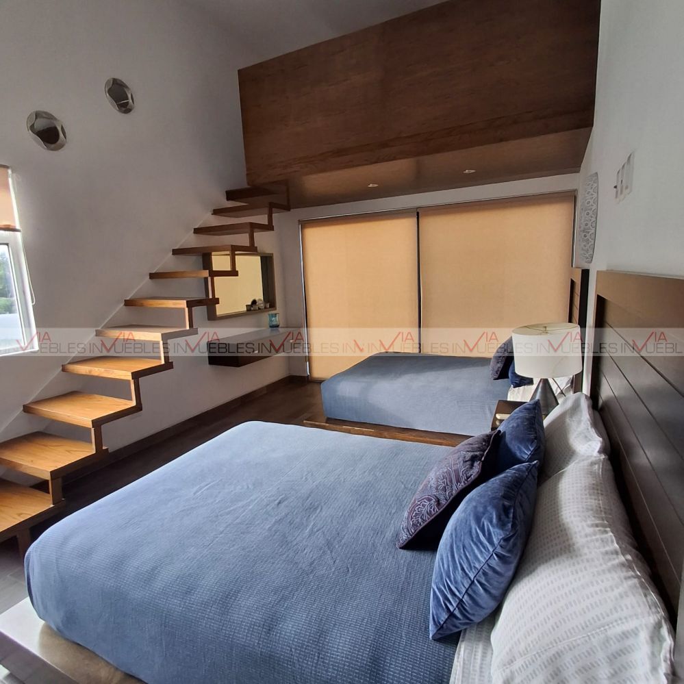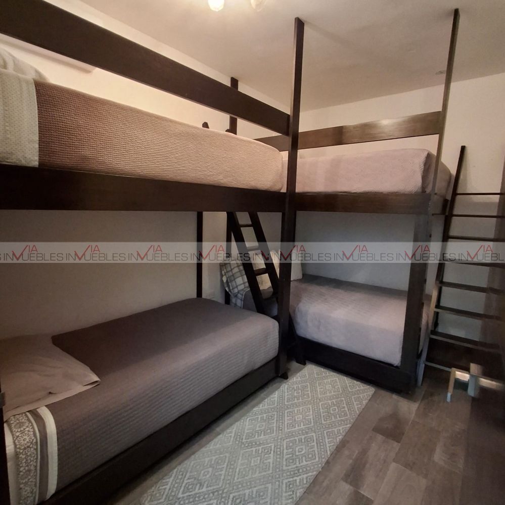 La casa es de dos plantas y. cuenta con 4 recámaras, dos de ellas con tapanco por lo que tienen mayor ocupación, además tiene un estudio y cuarto de TV. Se entrega completamente amueblada y equipada. Dentro del equipamiento cuenta con: Cuarto de servicio, bodega, cuarto de máquinas, doble acceso con portón eléctrico, cisterna, caldera, aire acondicionado, calefacción, planta de luz, internet y cámaras de vigilancia.
