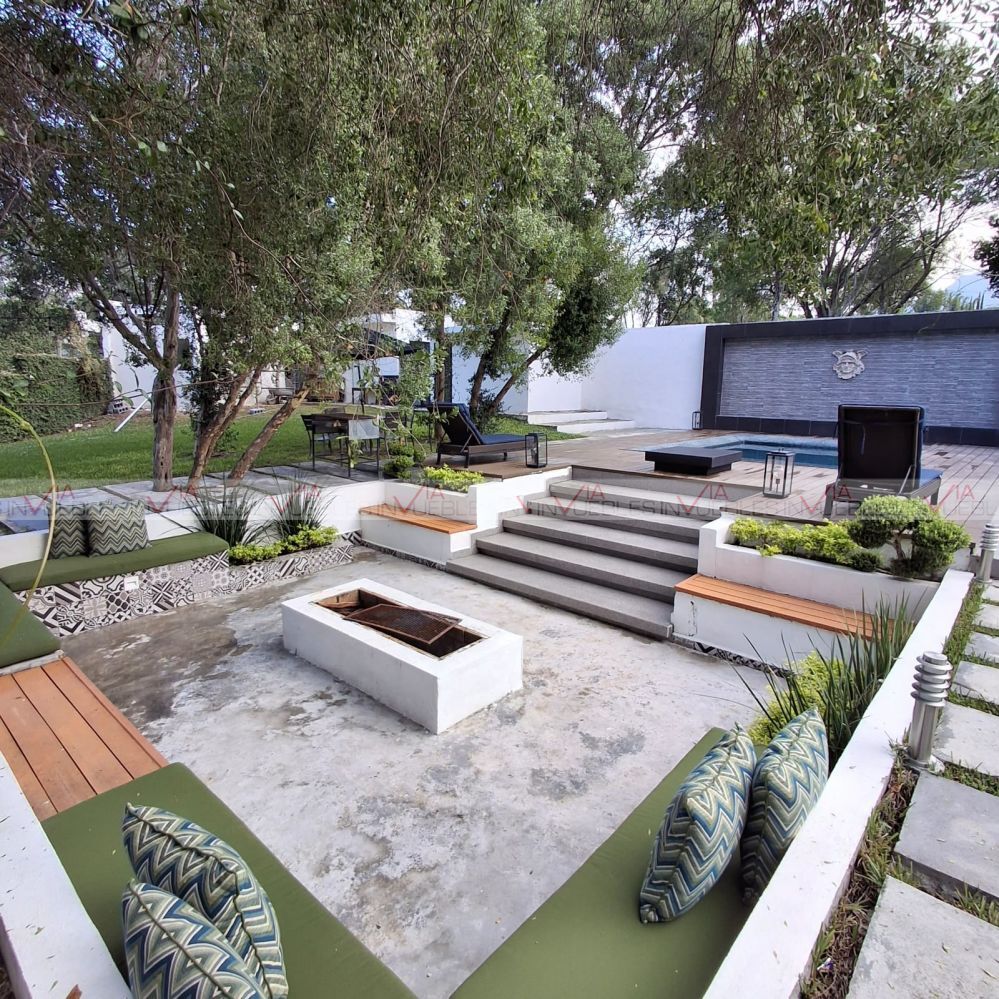 La casa cuenta con un gran jardín exterior de 4000 m2, por el cual pasa un arroyo el cual está enmarcado con un bello puente de madera. Es un verdadero lugar de ensueño que tiene grandes espacios para disfrutar como jacuzzi, alberca, bar exterior, cocina exterior de acero inoxidable, fogatero, cancha de usos multiples, y una gran terraza para eventos.