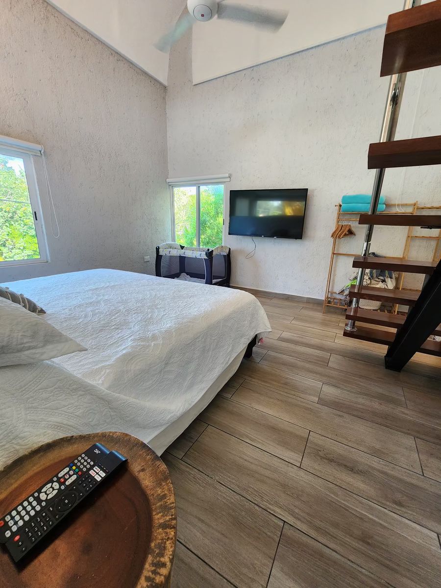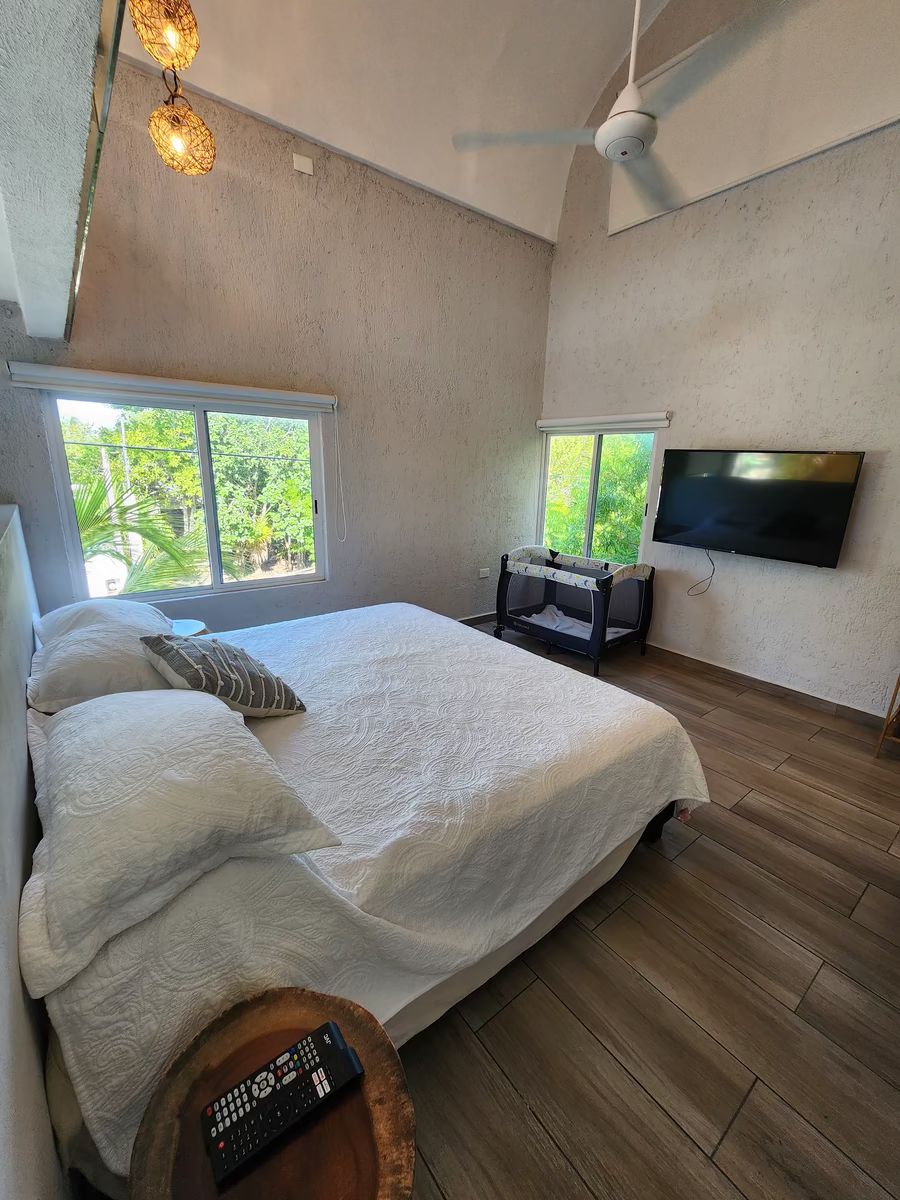 Recámara principal con cama king size, aire acondicionado y baño completo