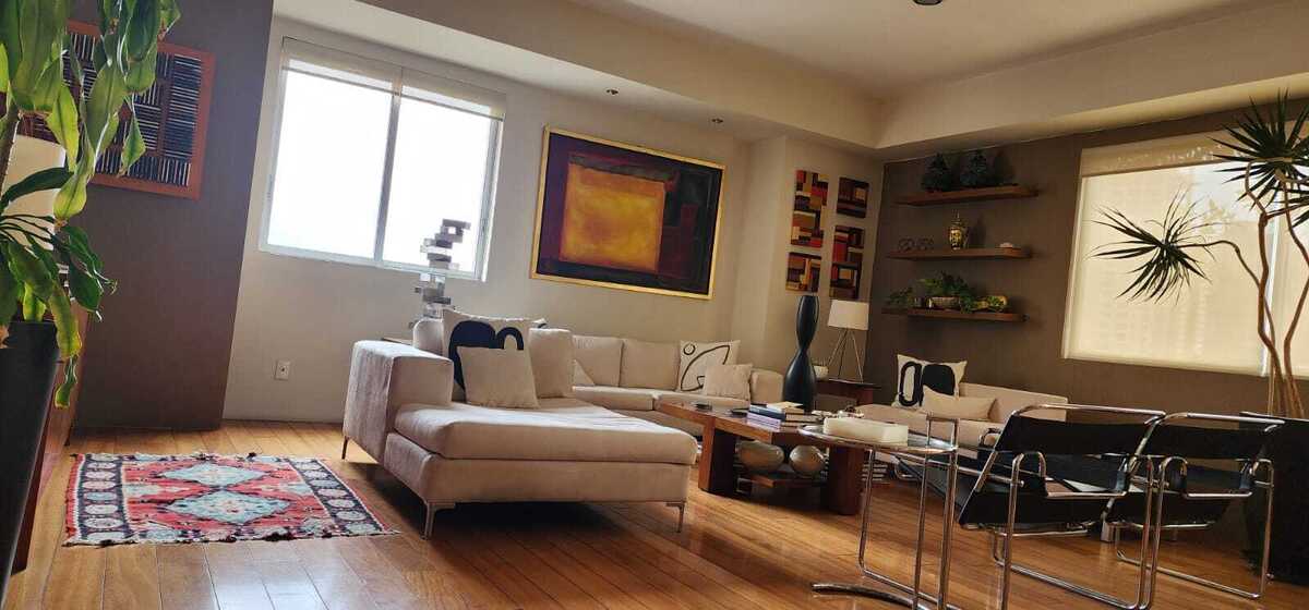 El departamento cuenta con tres recámaras, dos baños completos y un medio baño, además de una cocina integral, cuarto y baño de servicio, y un área de lavado. Los acabados de lujo en madera, aluminio y los detalles modernos en su decoración lo hacen único y sofisticado.