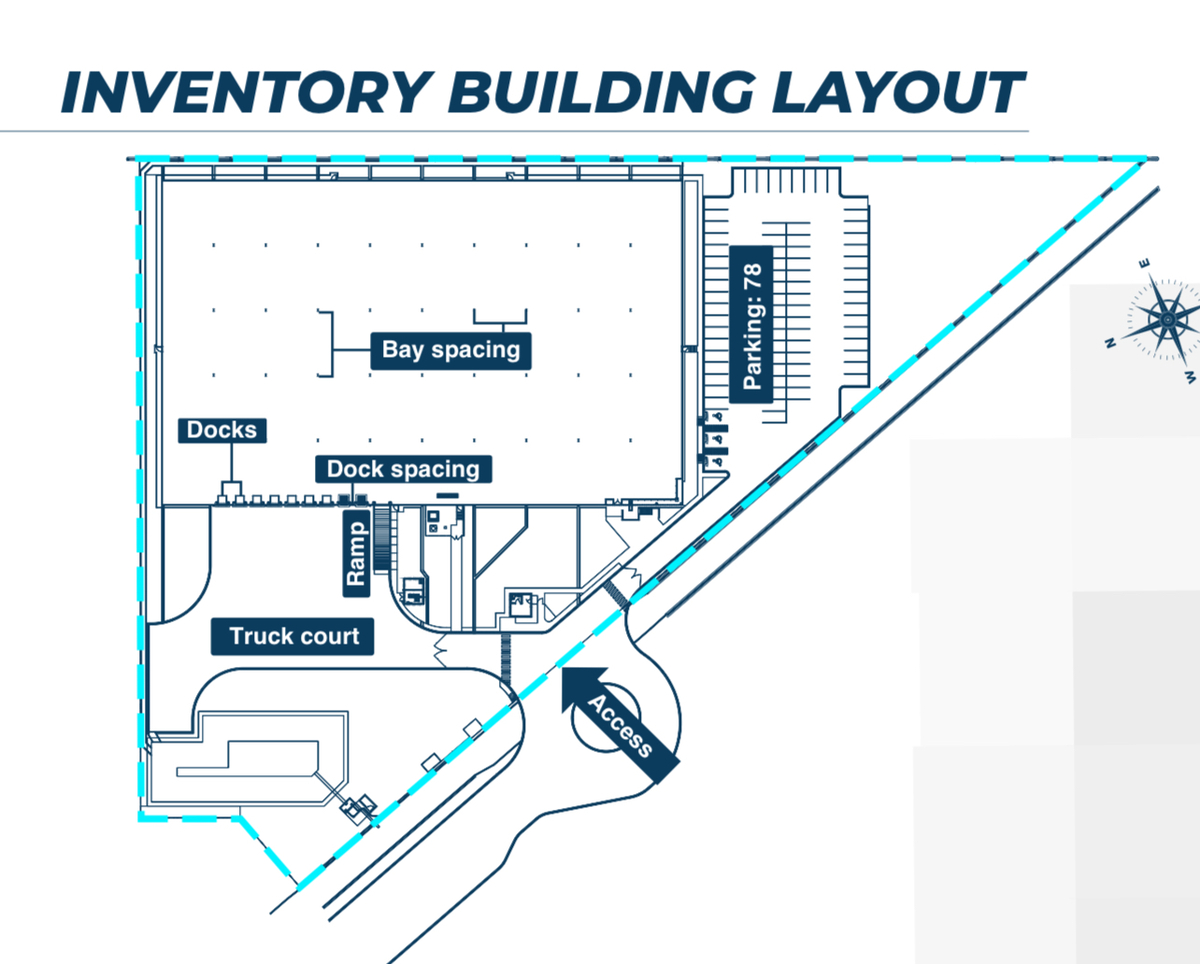 - Docks and ramps. 2 Equipped docks w/9’x10’ manual roll-up door, 1 forklift ramp w/12’x14’ roll-up door, 7 wall knockouts for docks or truck parking stalls.