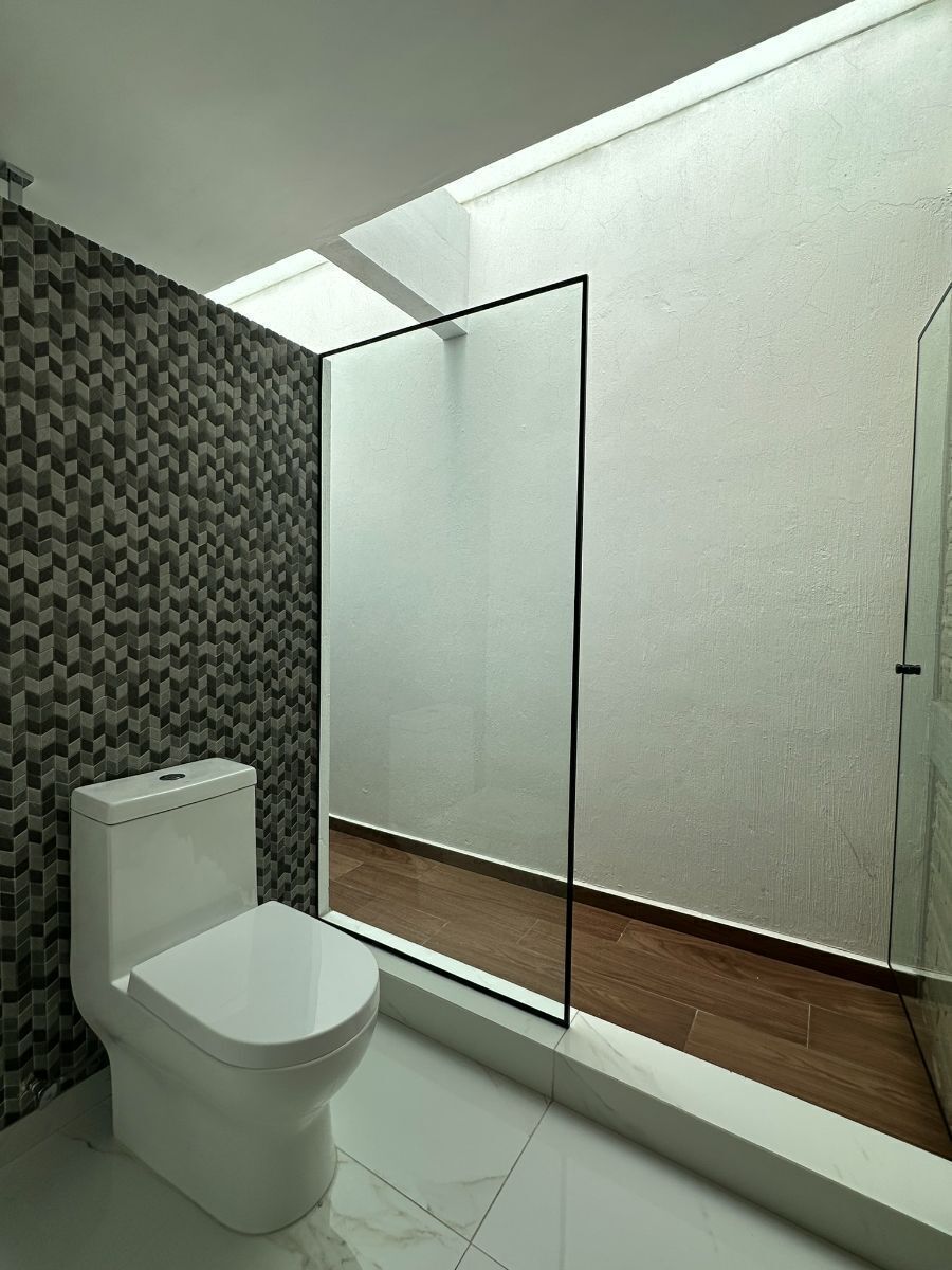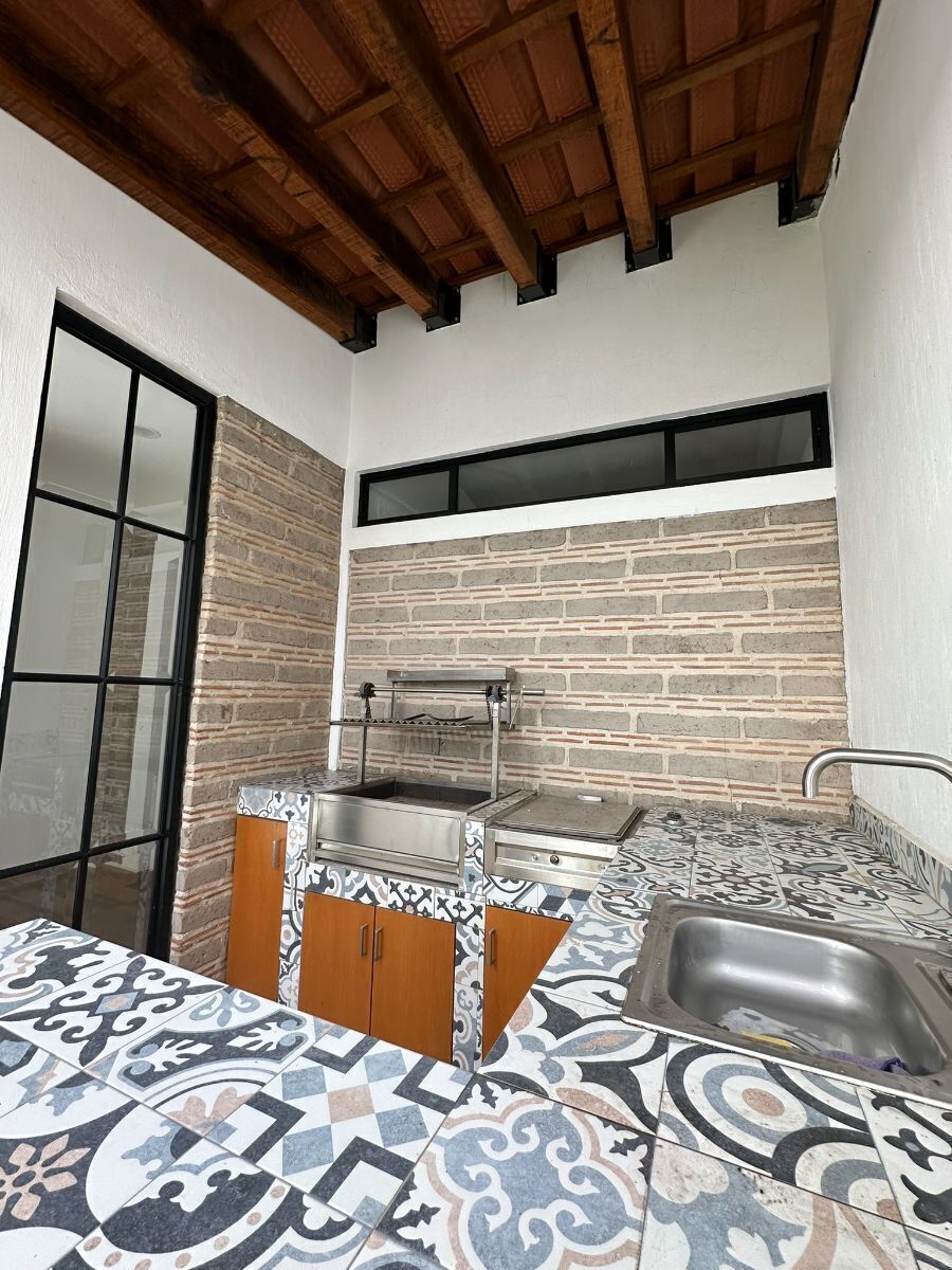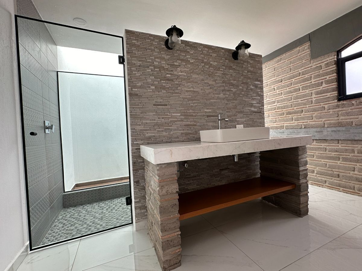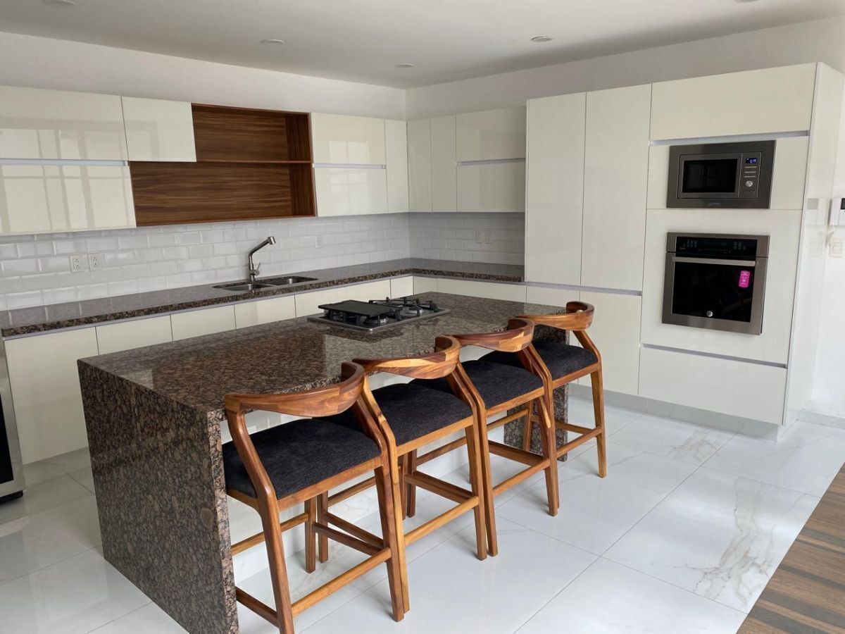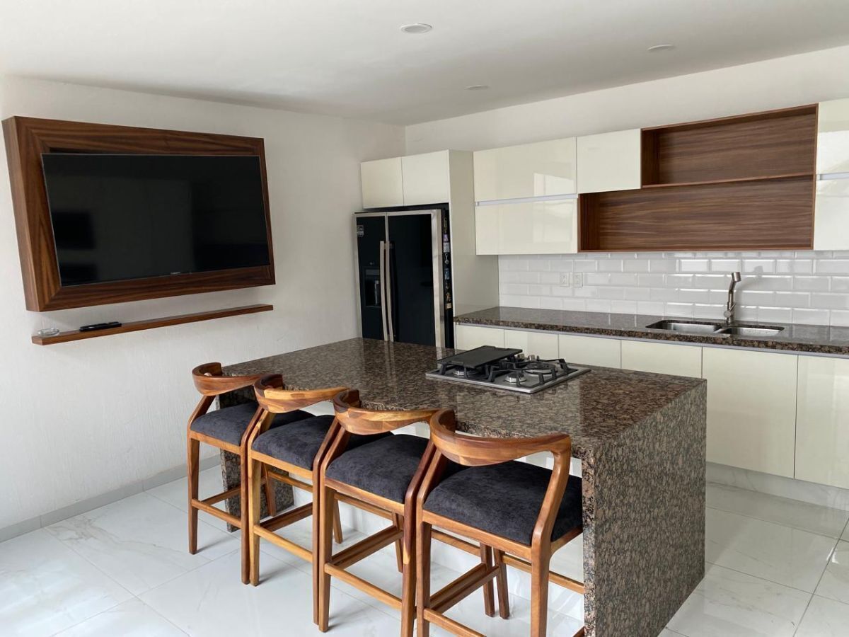 Al ingresar, te recibe una cochera para 2 autos con portón eléctrico, un recibidor que da paso a un jardín lateral privado con bodega y área de servidumbre. La cocina integral, de gran amplitud, está completamente equipada con triturador en la tarja, una moderna barra desayunador de cuarzo y mármol importado. La sala y el comedor, independientes de la cocina, se conectan por medio de ventanales corredizos que se abren hacia la terraza y el área de asador, que incluye un impresionante asador argentino con elevador, creando un área social perfecta para la convivencia. El área de bar con tarja y el salón de televisión ofrecen un ambiente único y relajado, ideal para disfrutar en familia o con amigos. En la planta baja, también encontrarás una recámara muy amplia con baño completo, closet, bodega y área de gimnasio, que tiene acceso directo al jardín mediante ventanales corredizos. Para completar el toque de distinción, un muro de descanso de piso a techo con fachaletas italianas aporta una atmósfera moderna y sofisticada.
