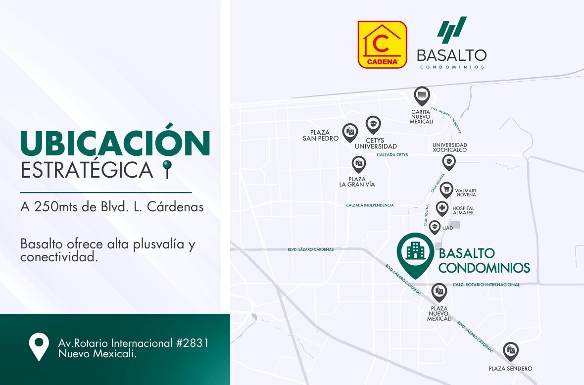Ubicado estratégicamente y con Plaza Comercial Integrada (Plaza Basalto), Basalto Condominios se convierte en un proyecto Innovador en su segmento, garantizando así su Éxito y Plusvalía, por ser una zona céntrica y ampliamente desarrollada, con gran cercanía a Universidades, Comercios, Indutrias, Garita de Cruce a EU y Aeropuerto, entre otros.
