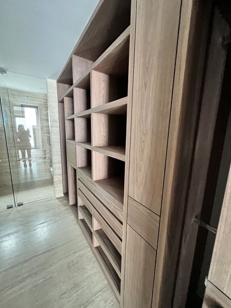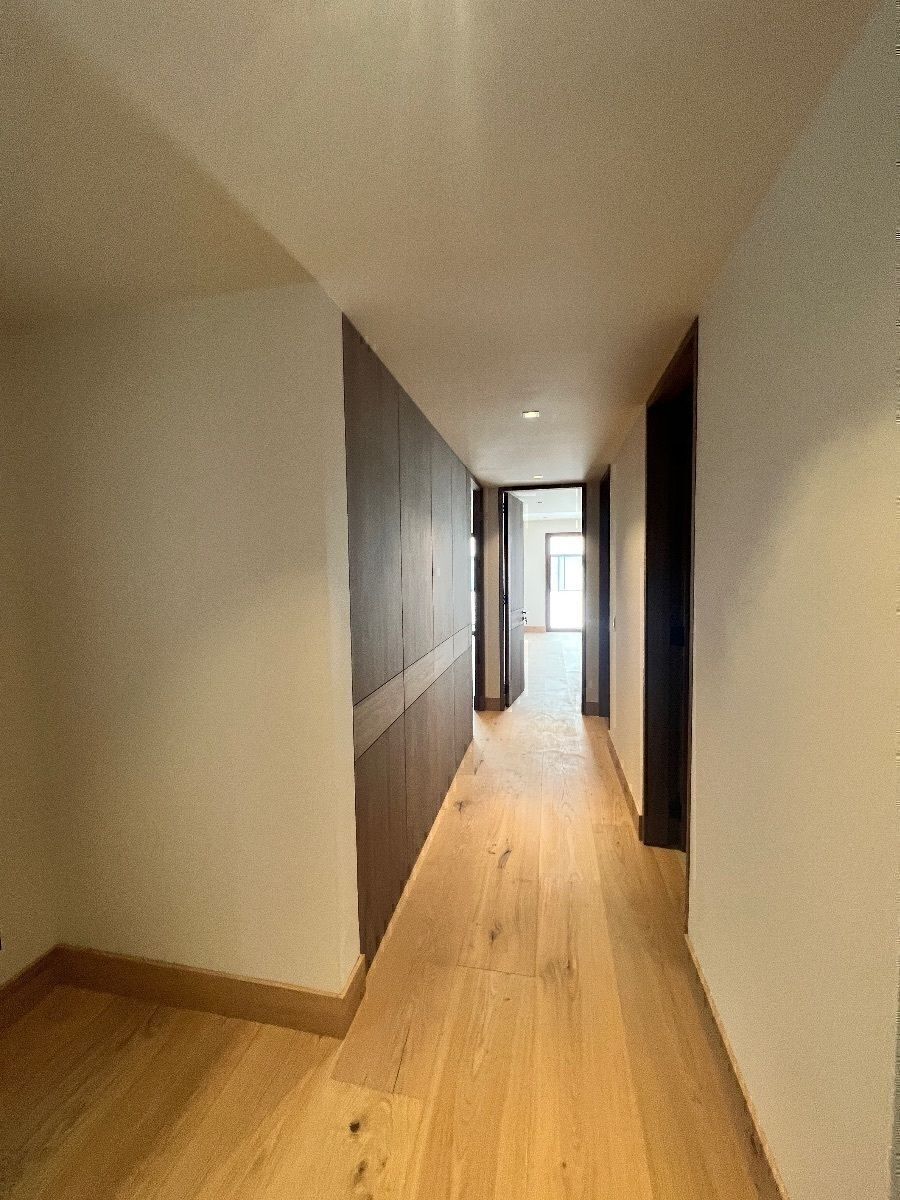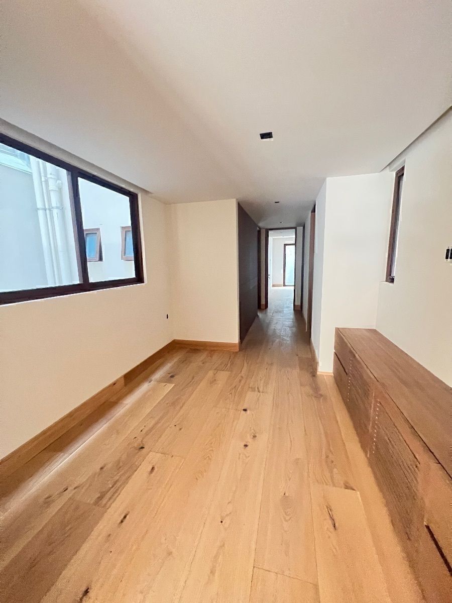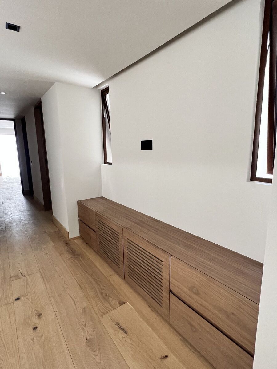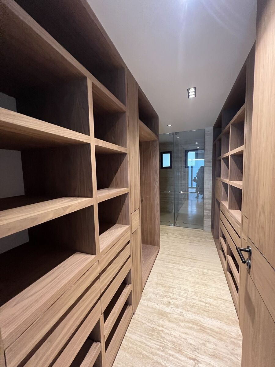 Luxury finishes, closets and built-in furniture made of walnut wood and marble, wooden floors. The kitchen countertop is made of white quartz.