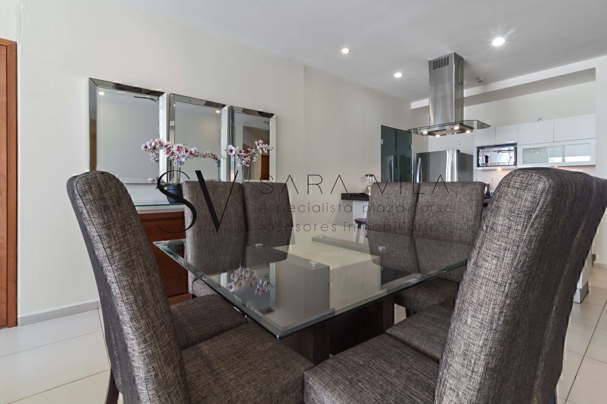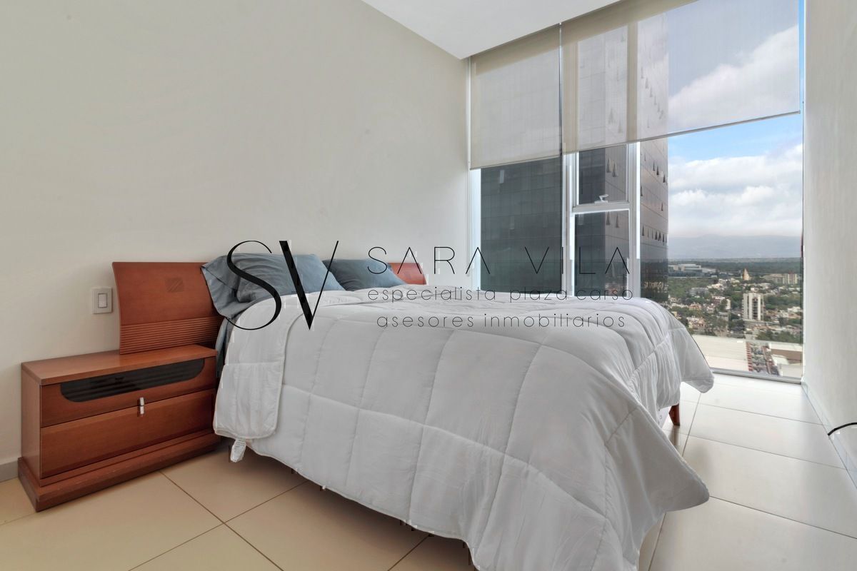 DEPARTAMENTO COMPLETAMENTE AMUEBLADO Y EQUIPADO: 115M2, 2 RECAMARAS CADA UNA CON BAÑO COMPLETO. RECAMARA PRINCIPAL CON VESTIDOR. BAÑO DE VISITAS. LINDA COCINA ABIERTA CON LAVAVAJILLAS. AREA DE LAVADO. TECHOS DE 3 METROS QUE LE DAN MUCHA LUZ Y AMPLITUD. ESTANCIAS MUY AMPLIAS. ESPECTACULARES VISTAS. 2 CAJONES DE ESTACIONAMIENTO. COMPLETO CONJUNTO DE AMENIDADES. ESTACIONAMIENTO PARA VISITAS. VIGILANCIA 24 HORAS. ACCESO DIRECTO AL CENTRO COMERCIAL. TORRE MUY BIEN UBICADA. MUEBLES INCLUIDOS EN EL PRECIO.