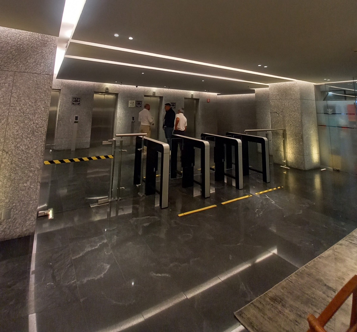 Doble escalera, la de emergencia de metal y la otra de granito.