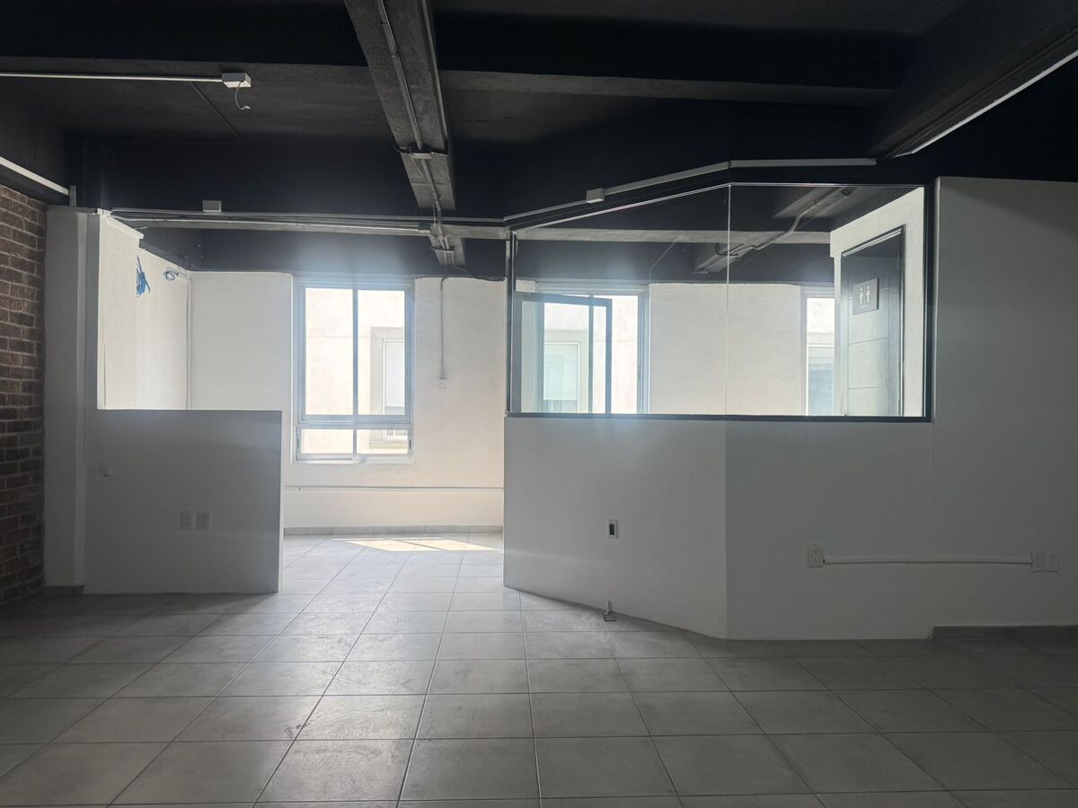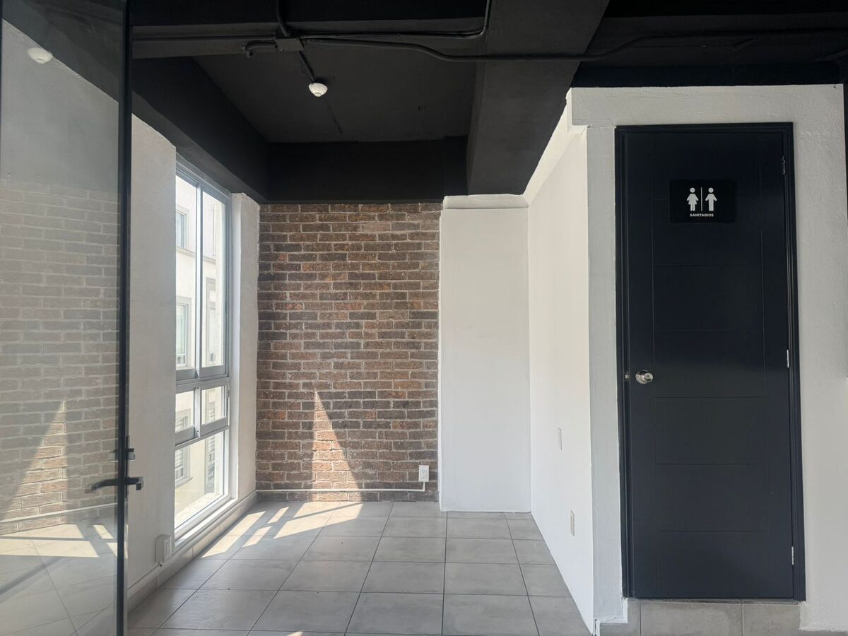 Descripción oficina: Espacio con oficina privada de cristales y baño privado, en los extremos 3 cubículos y área de oficinas generales central abierta. Espacio para cocineta pequeña. Baños en piso para hombre y mujer.