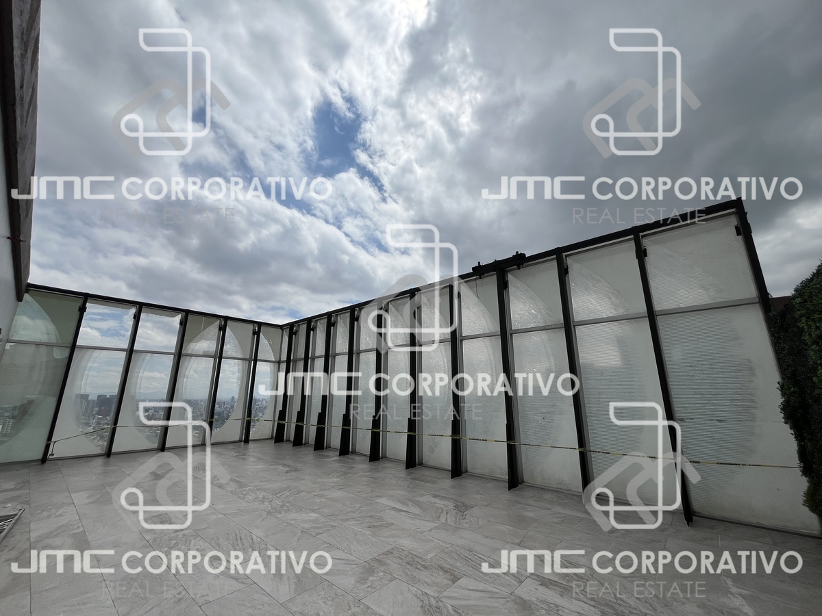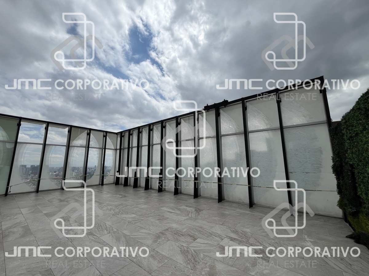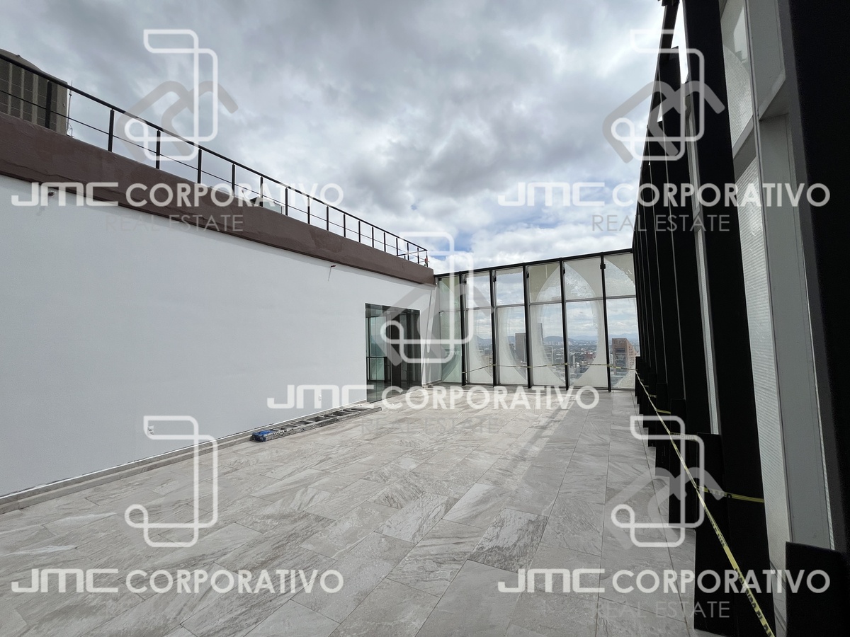 Nivel 25: Roof Garden, cuenta con una recepción, cuatro salas de juntas, dos de ellas con elementos audiovisuales, barra de café y terraza abierta con mobiliario.