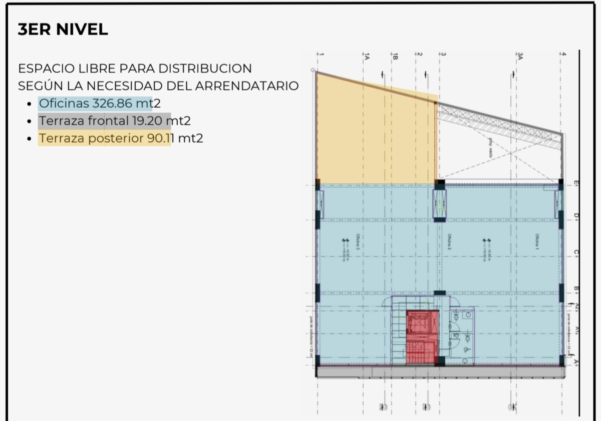 El tercer piso cuenta con 326.86 metros cuadrados habitables, 19.20 metros cuadrados de terraza frontal y 90.11 metros cuadrados de terraza posterior.