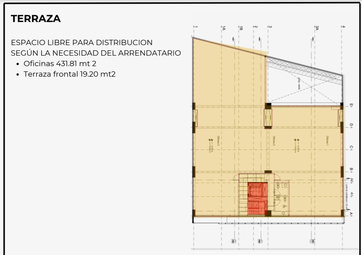 El quinto piso cuenta con 431.81 metros cuadrados más 19.20 metros cuadrados de terraza frontal.