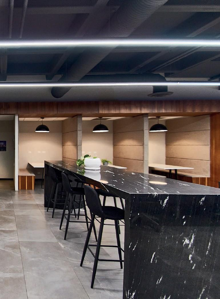 . Café-bar, áreas comunes y coworking para networking e interacción en un ambiente cómodo y colaborativo.