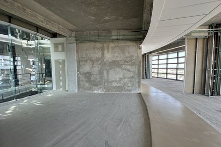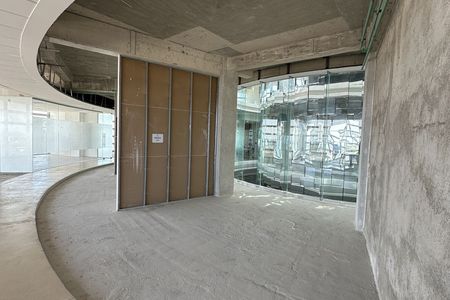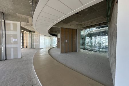 El edificio tiene una forma circular con un radio exterior de 22.75m donde las oficinas y el