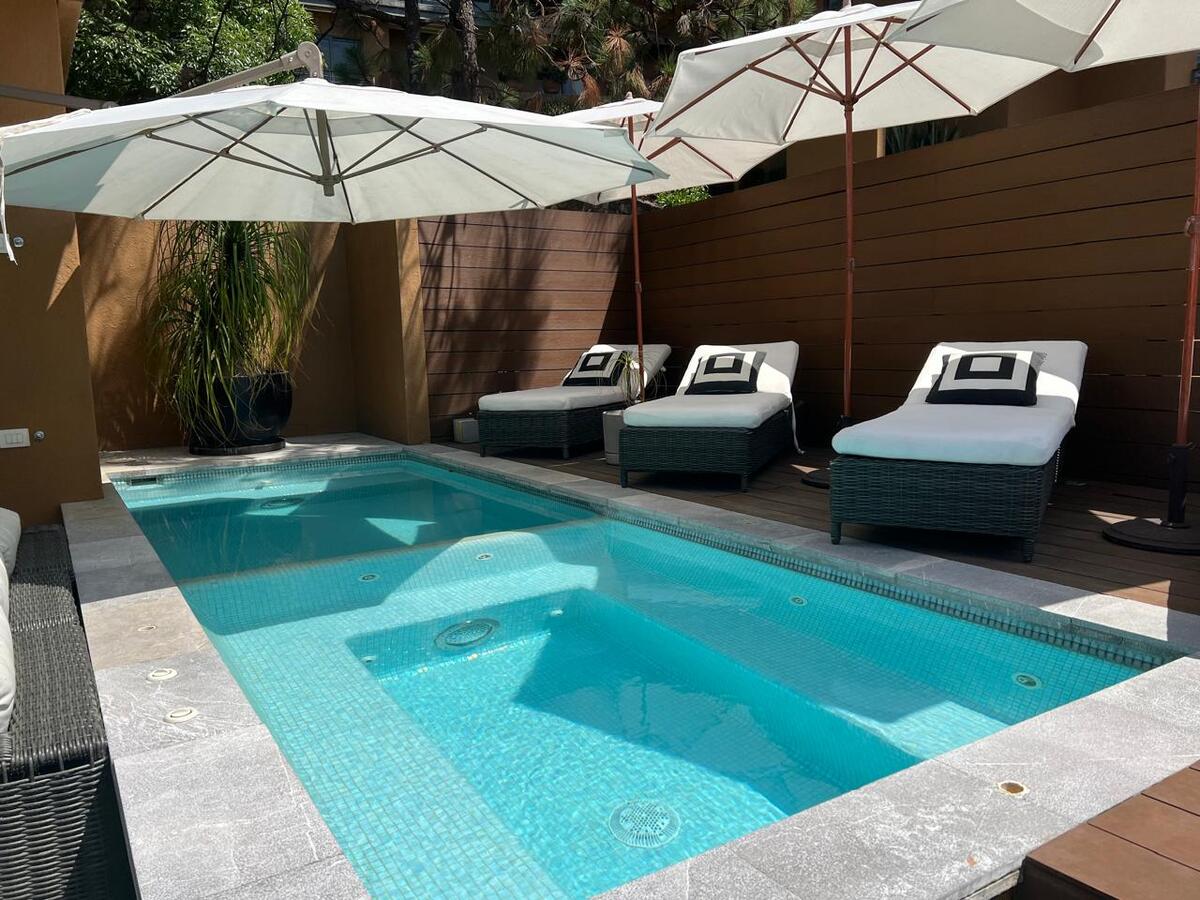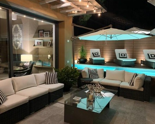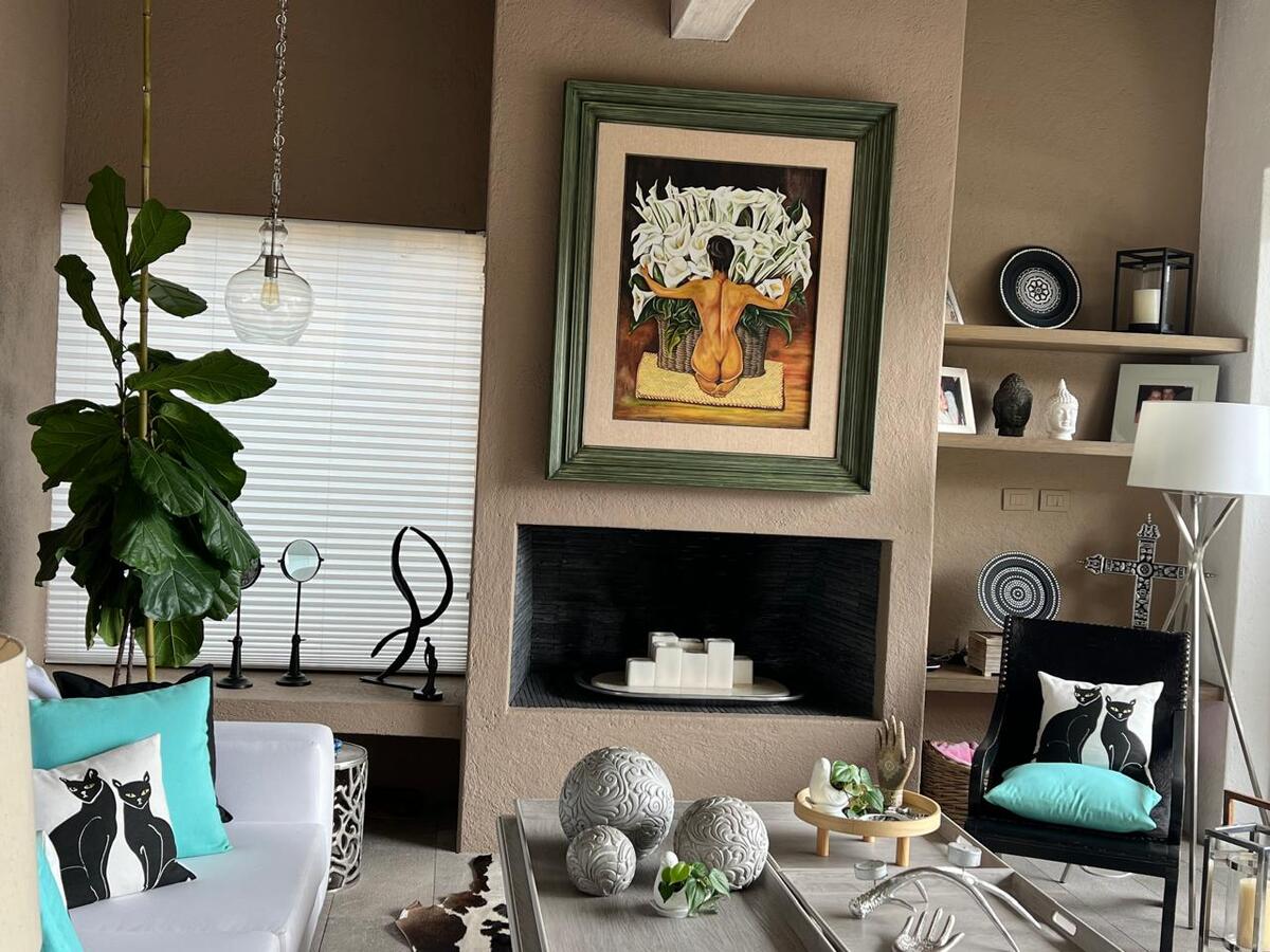 Primer Nivel con alberca, jacuzzi, tumbonas, mesa comedor para exterior en amplia terraza que se comunica con el Bar equipado con TV plasma y escalera para subir al Roof Garden. Entrada Principal vestíbulo con medio baño de visitas. Cocina cerrada, sala, comedor con ventanal corredizo que se integra a la terraza. Tiene cuatro recamaras en el segundo nivel, todas con closet y baño. La principal con vestidor, sauna y vista al jardín. En el mismo nivel un área familiar central. Tercer nivel con salón de juegos y salida al jardín, lavandería y cuarto de servicio con baño.