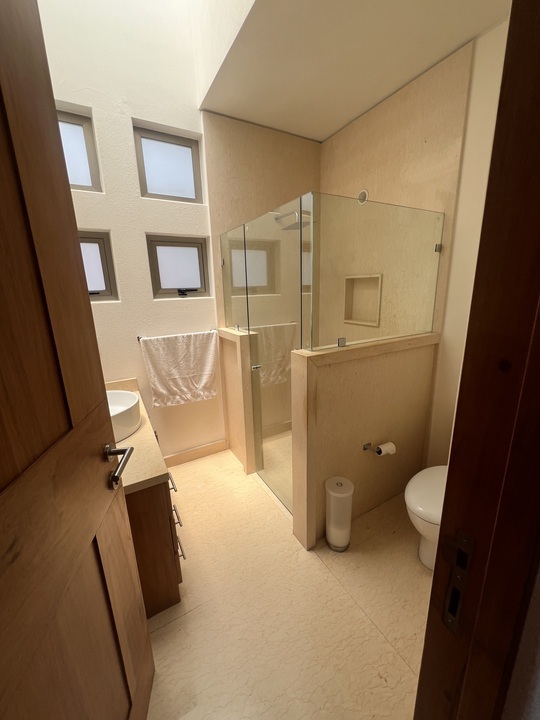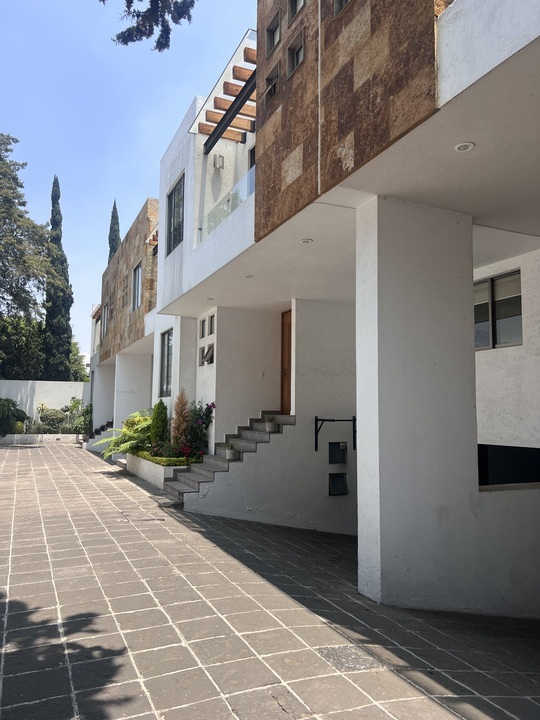 Cuenta con 3 recámaras, cada una con vestidor, 4.5 baños, medio baño de vistas, estudio, sala de TV; cocina con desayunador, terraza, 6 estacionamientos techas y Jardín de 50m2.