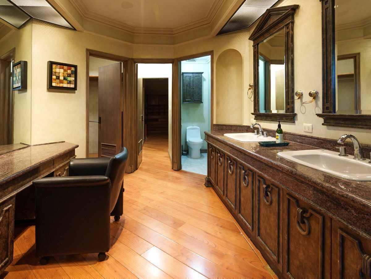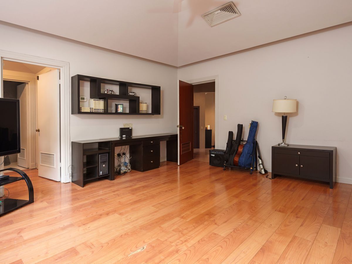 On the upper floor, there are three bedrooms, each with a full bathroom and walk-in closet, as well as a family TV room that provides privacy and comfort to the intimate area.