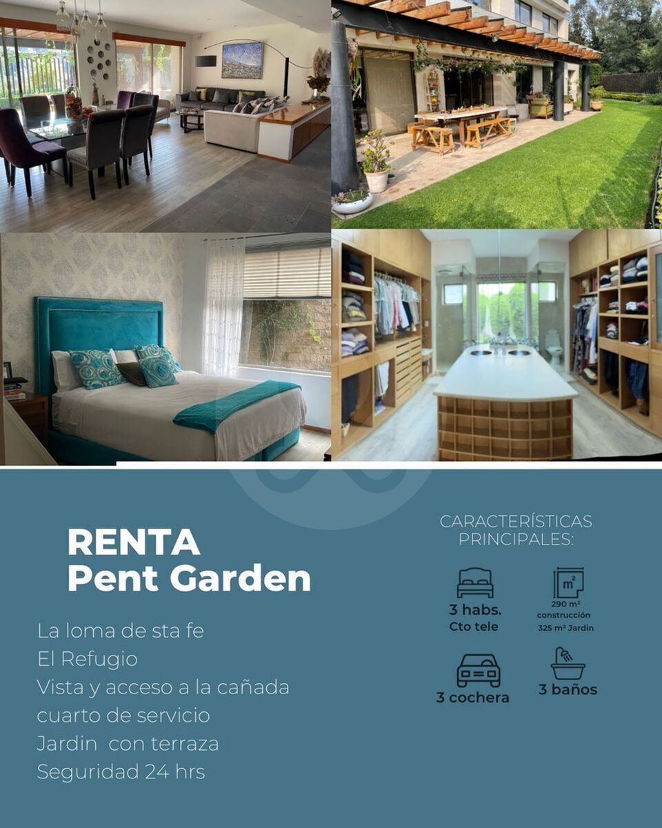 Garden dentro de la Loma de Santa fe, en conjunto de casas y departamentos, dentro del Refugio con vista a la cañada que es una zona federal de uso esclusivo únicamente para el departamento, donde se encuentran asadores y una pista muy agradable para correr, como si fuese tu propia casa en Valle. El departamento tiene una terraza con vista y acceso a esa zona, bardeado con seguridad. Jardin de 325m2 mas.