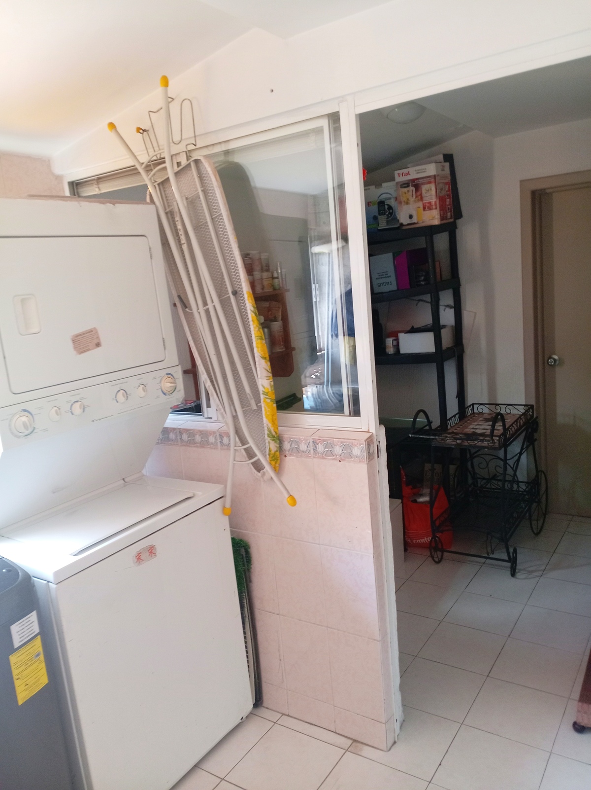 Laundry area and service room divided with a partition for greater privacy and aesthetics.
