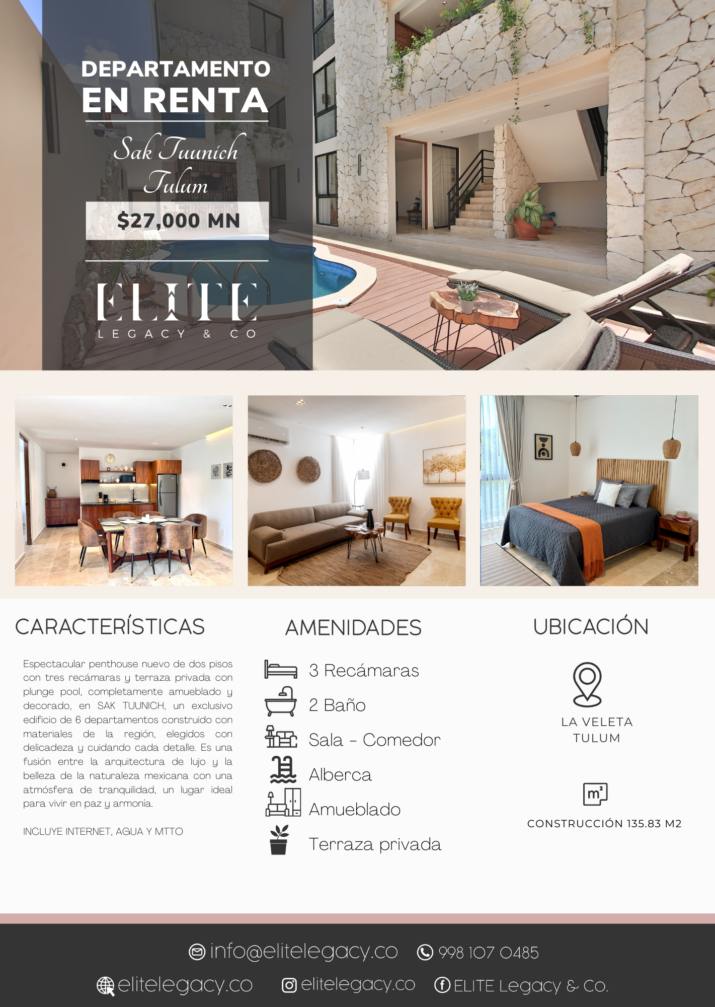 Espectacular penthouse nuevo de dos pisos con tres recámaras y terraza privada con plunge pool, completamente amueblado y decorado, en SAK TUUNICH, un exclusivo edificio de 6 departamentos construido con materiales de la región, elegidos con delicadeza y cuidando cada detalle. Es una fusión entre la arquitectura de lujo y la belleza de la naturaleza mexicana con una atmósfera de tranquilidad, un lugar ideal para vivir en paz y armonía.