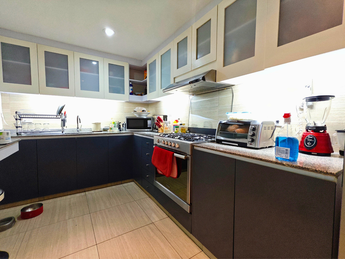 Cocina cerrada con barra de comedor y amplios alaceneros