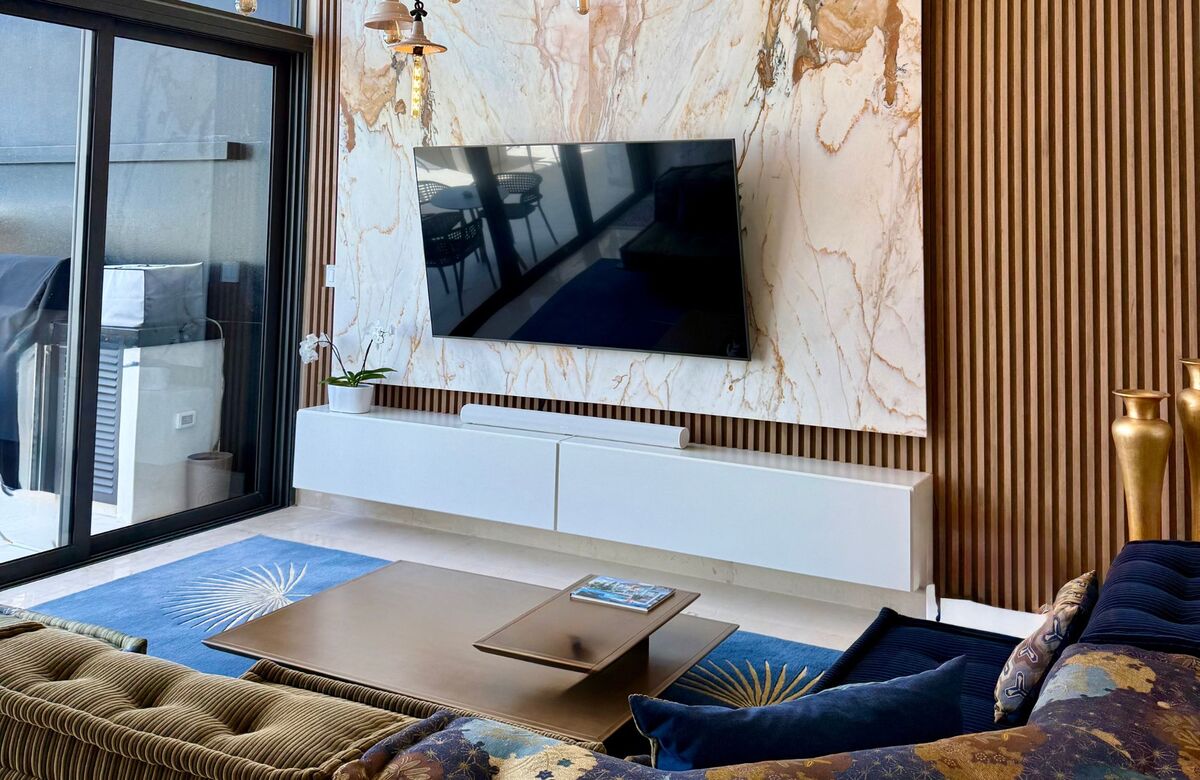 Unidad de TV en mármol y mobiliario de diseñador Roche Bobois