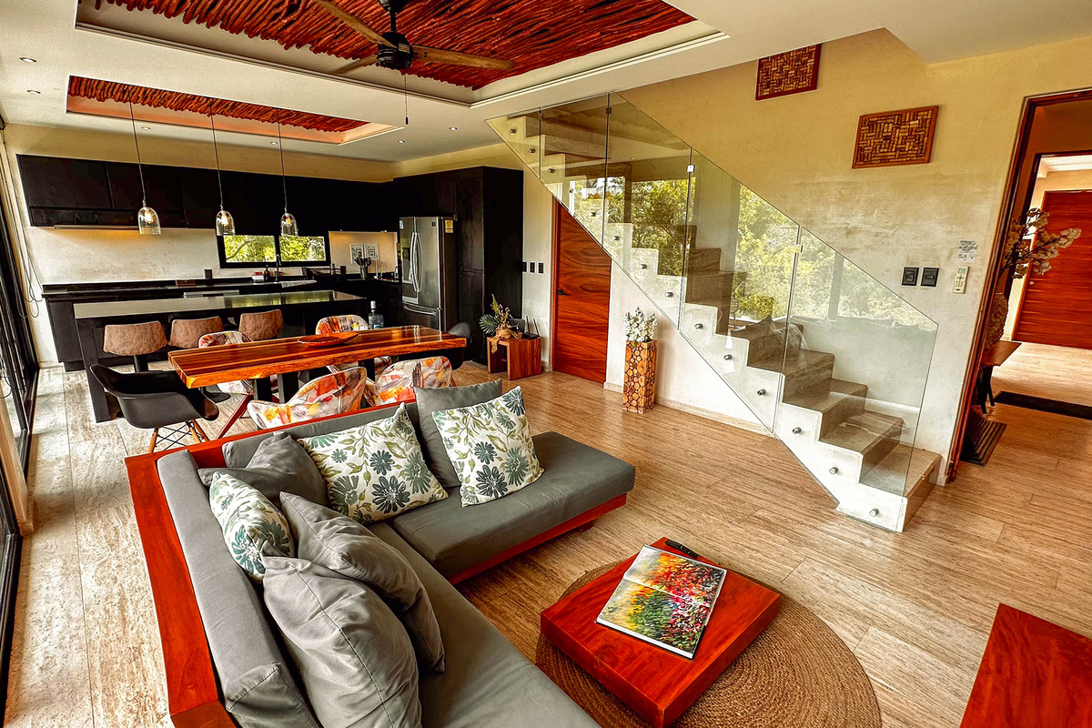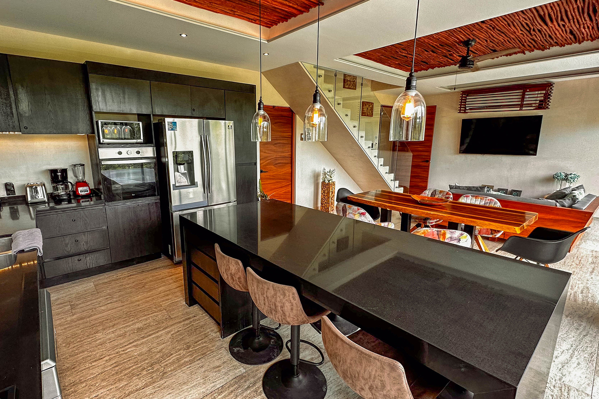 Exclusivo penthouse de tres niveles ubicado en uno de los desarrollos más prestigiosos de Tulum. Con 299.42 m² (3,223.9 ft²), esta residencia combina elegancia contemporánea, amplitud y privacidad, rodeada de naturaleza y a pocos minutos del mar Caribe. Cuenta con dos accesos independientes y la posibilidad de dividirse en tres apartamentos tipo lock-off, ideal para inversión. El nivel principal integra sala, comedor y cocina con cubiertas de cuarzo, isla para seis personas y pisos de mármol travertino. Grandes ventanales con canceles anti-huracanes aportan luz natural y seguridad.