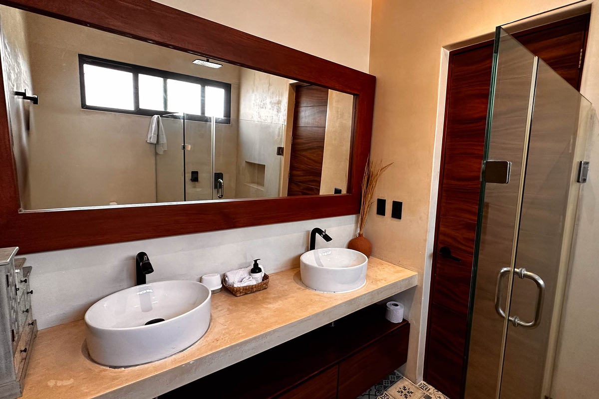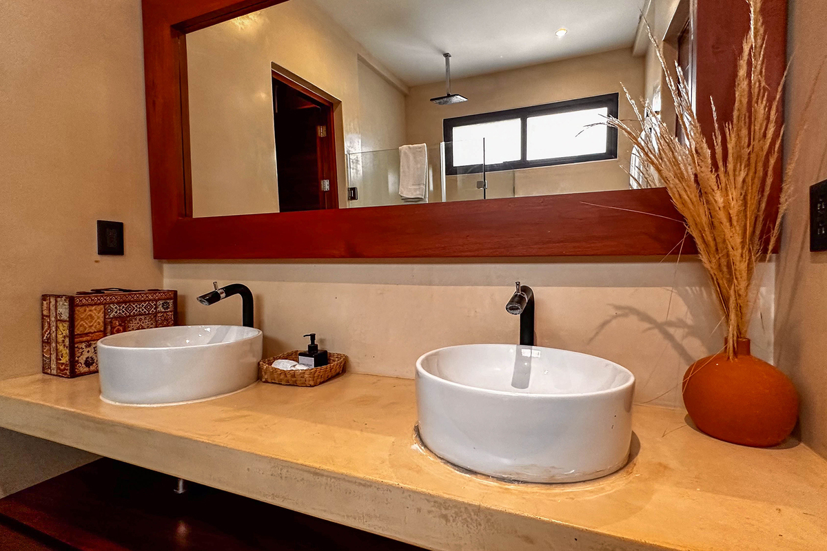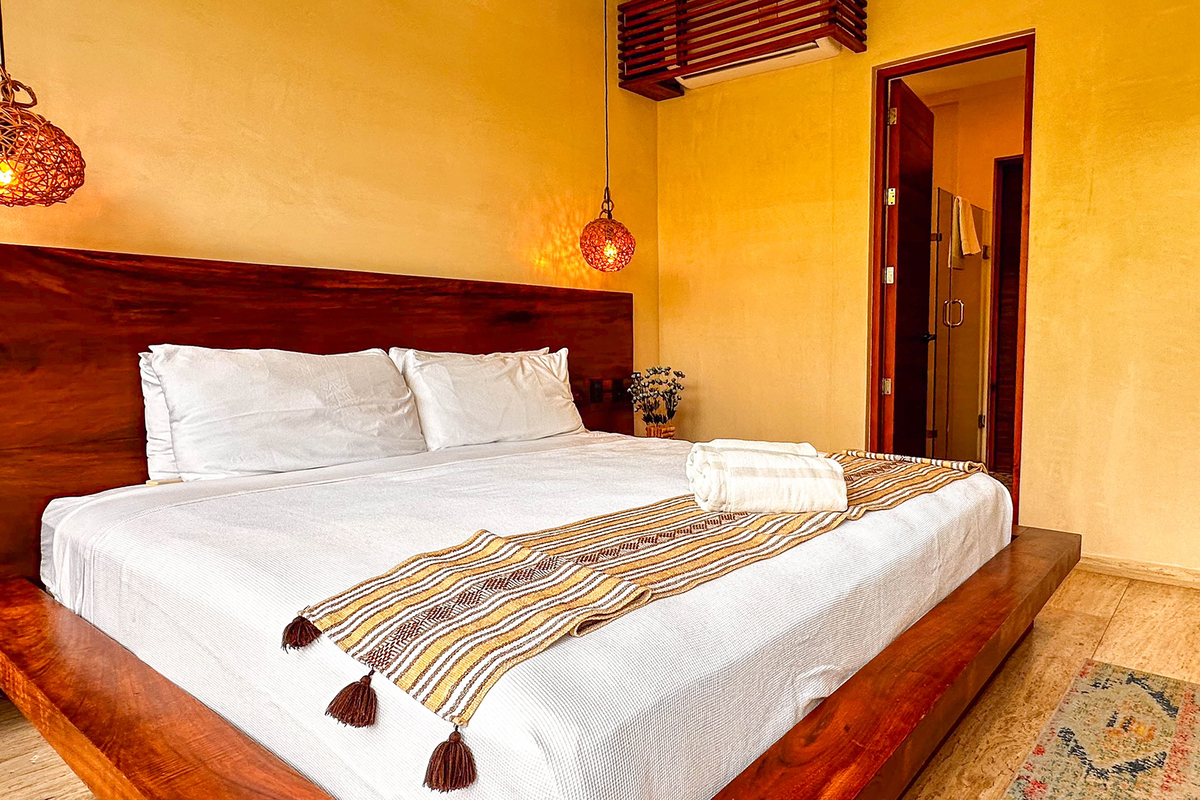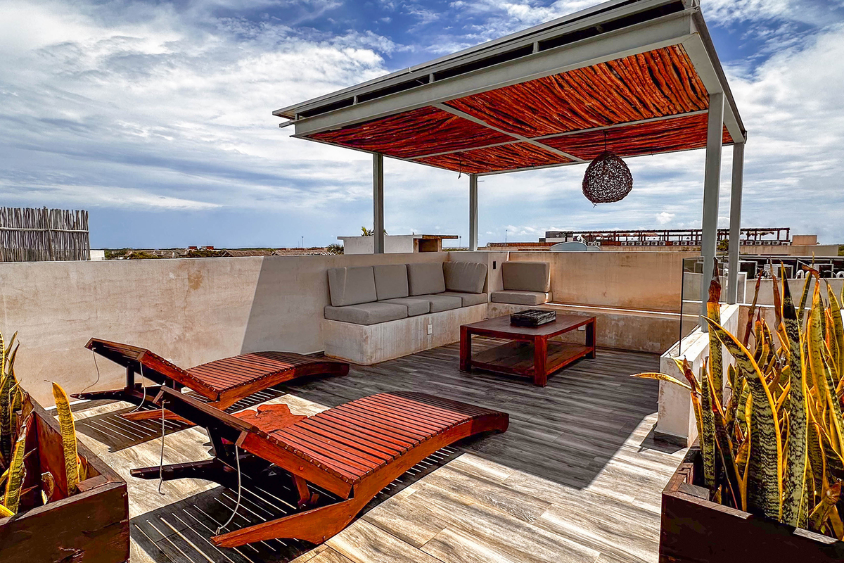 Dispone de tres recámaras con walk-in closets, aire acondicionado y baños decorados con mosaicos tradicionales; en total, cuatro baños de lujo. En la terraza del tercer piso se encuentra una alberca privada y áreas para entretenimiento. El rooftop ofrece vistas panorámicas al mar, camastros y sala exterior, perfecto para atardeceres inolvidables.