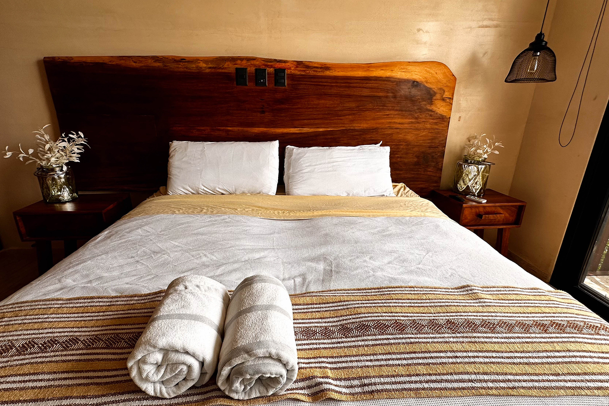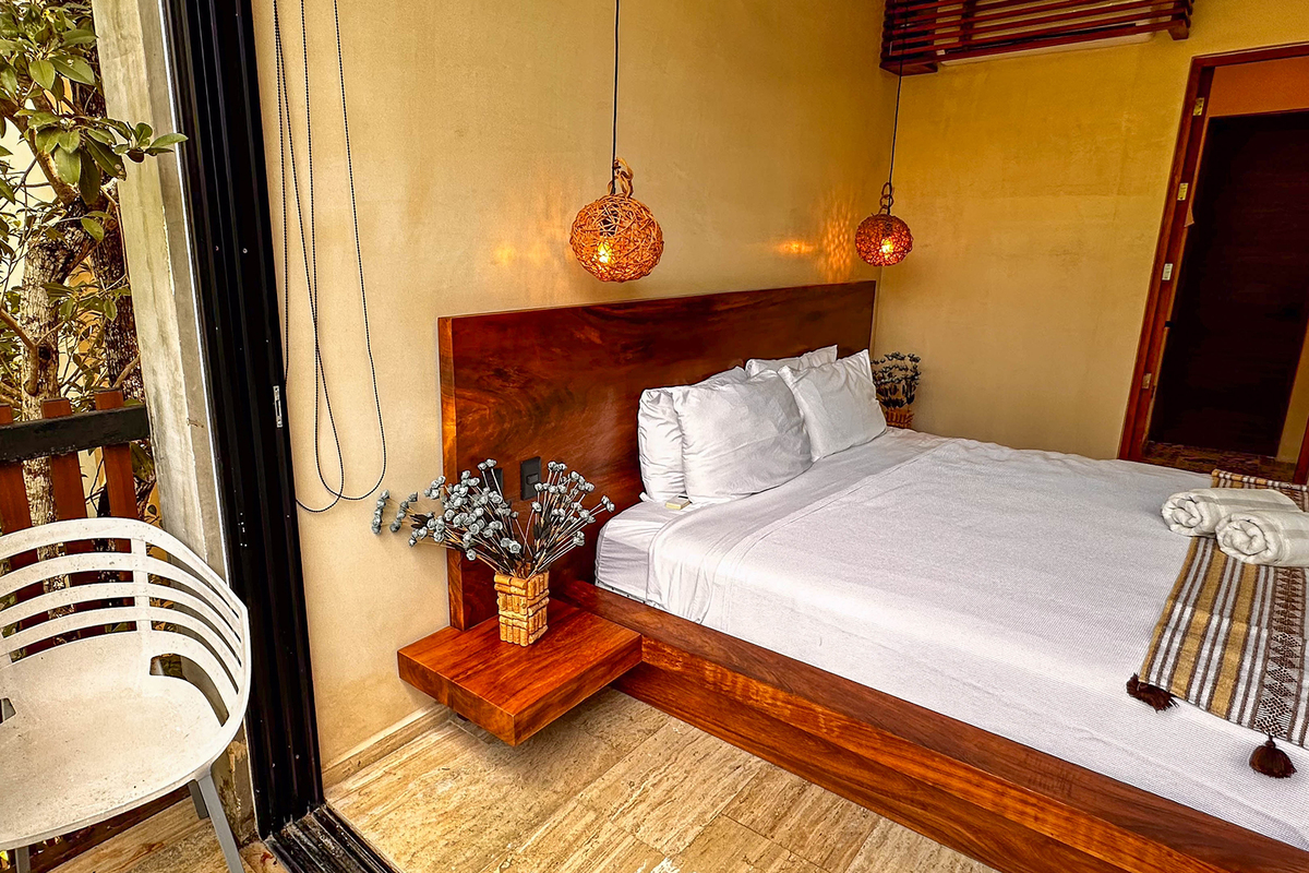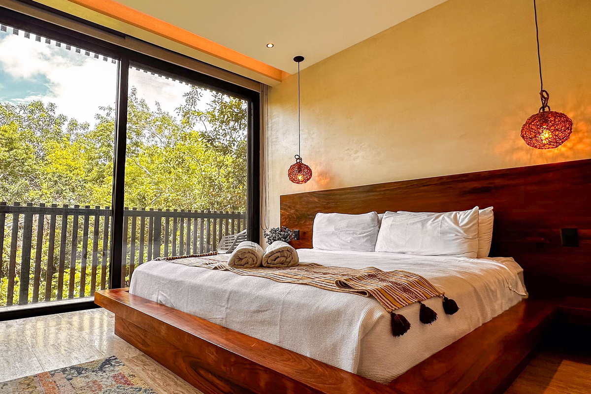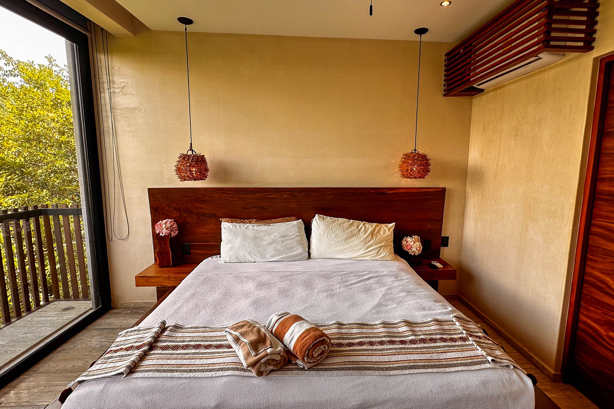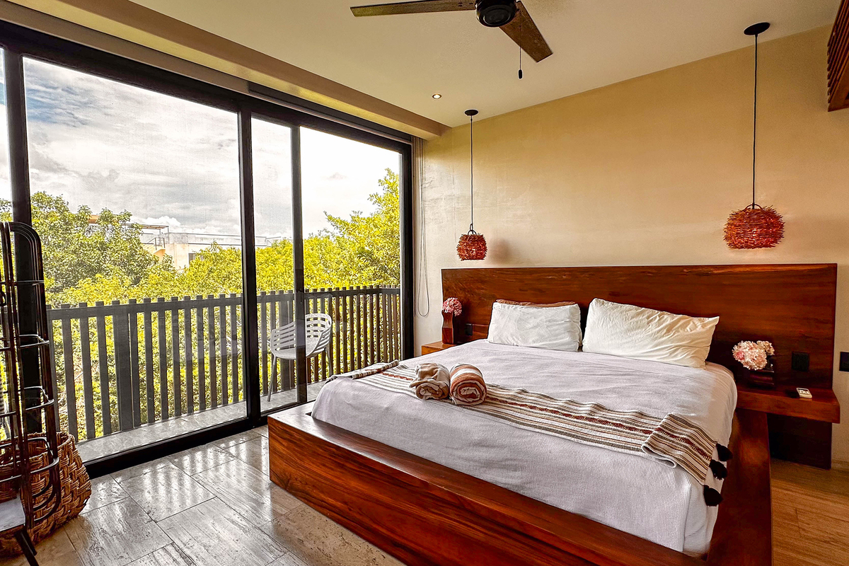 Dispone de tres recámaras con walk-in closets, aire acondicionado y baños decorados con mosaicos tradicionales; en total, cuatro baños de lujo. En la terraza del tercer piso se encuentra una alberca privada y áreas para entretenimiento. El rooftop ofrece vistas panorámicas al mar, camastros y sala exterior, perfecto para atardeceres inolvidables.