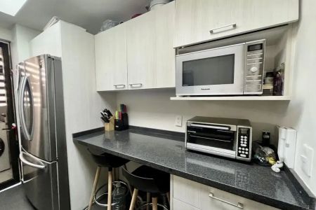 - Cocina abierta con barra, horno de microondas, alacenas y espacio para lavavajillas y refrigerador