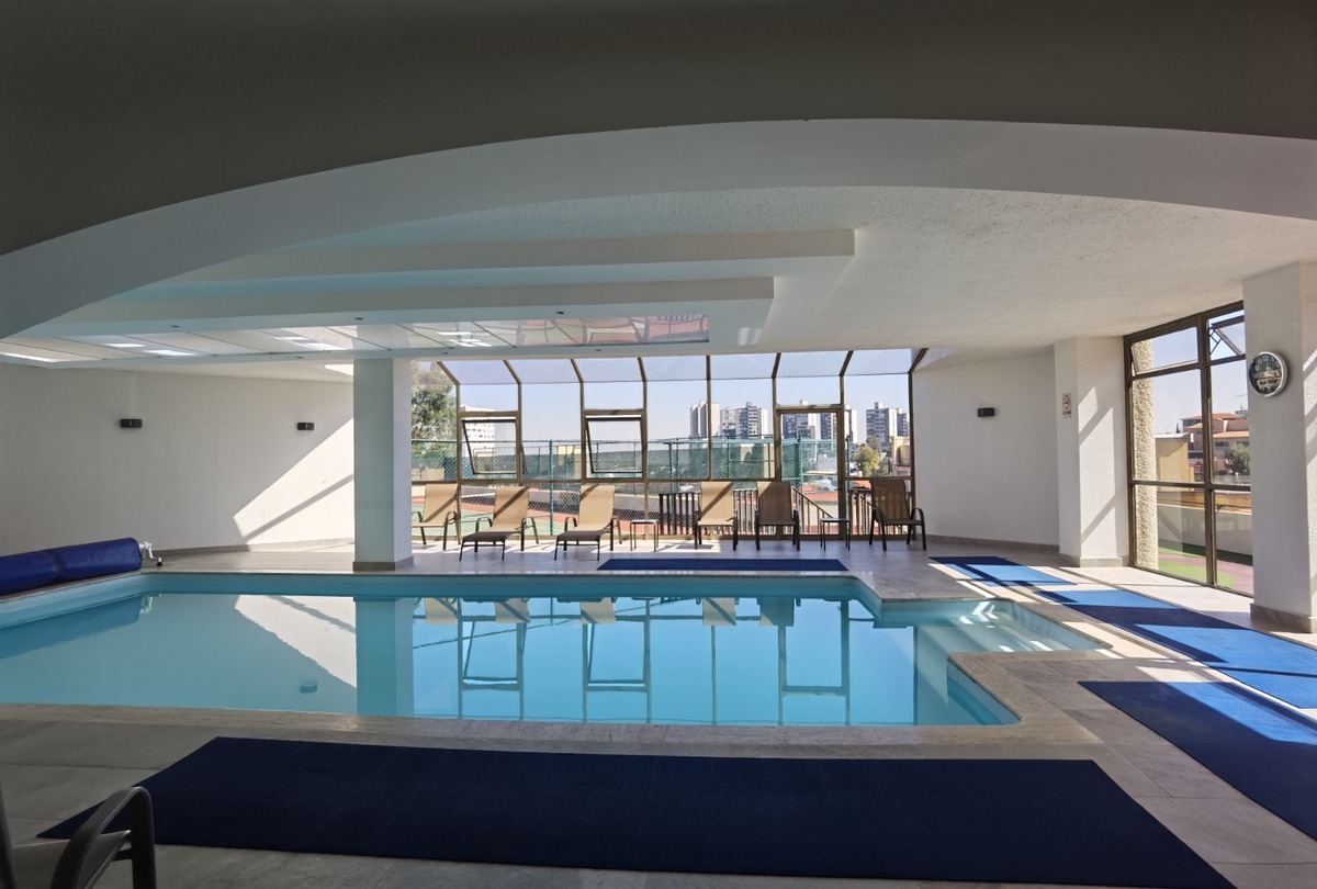 Areas comunes: alberca, sauna, vapor, gimnasio, jardín con juegos infantiles, y ludoteca, asadores, cancha de tenis, salón de usos múltiples.