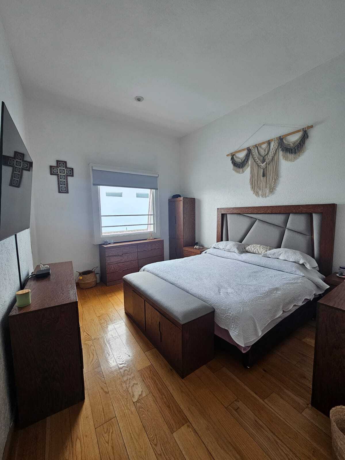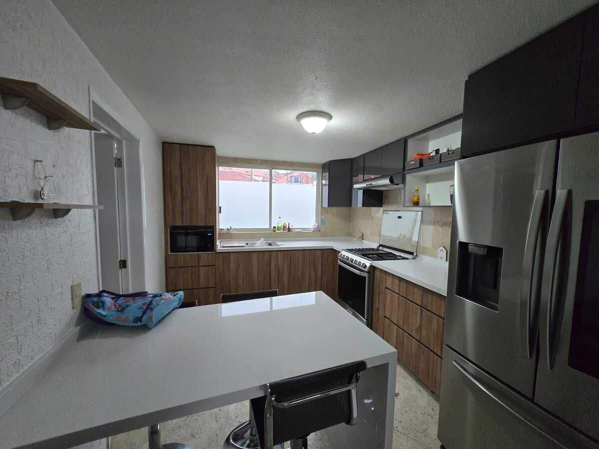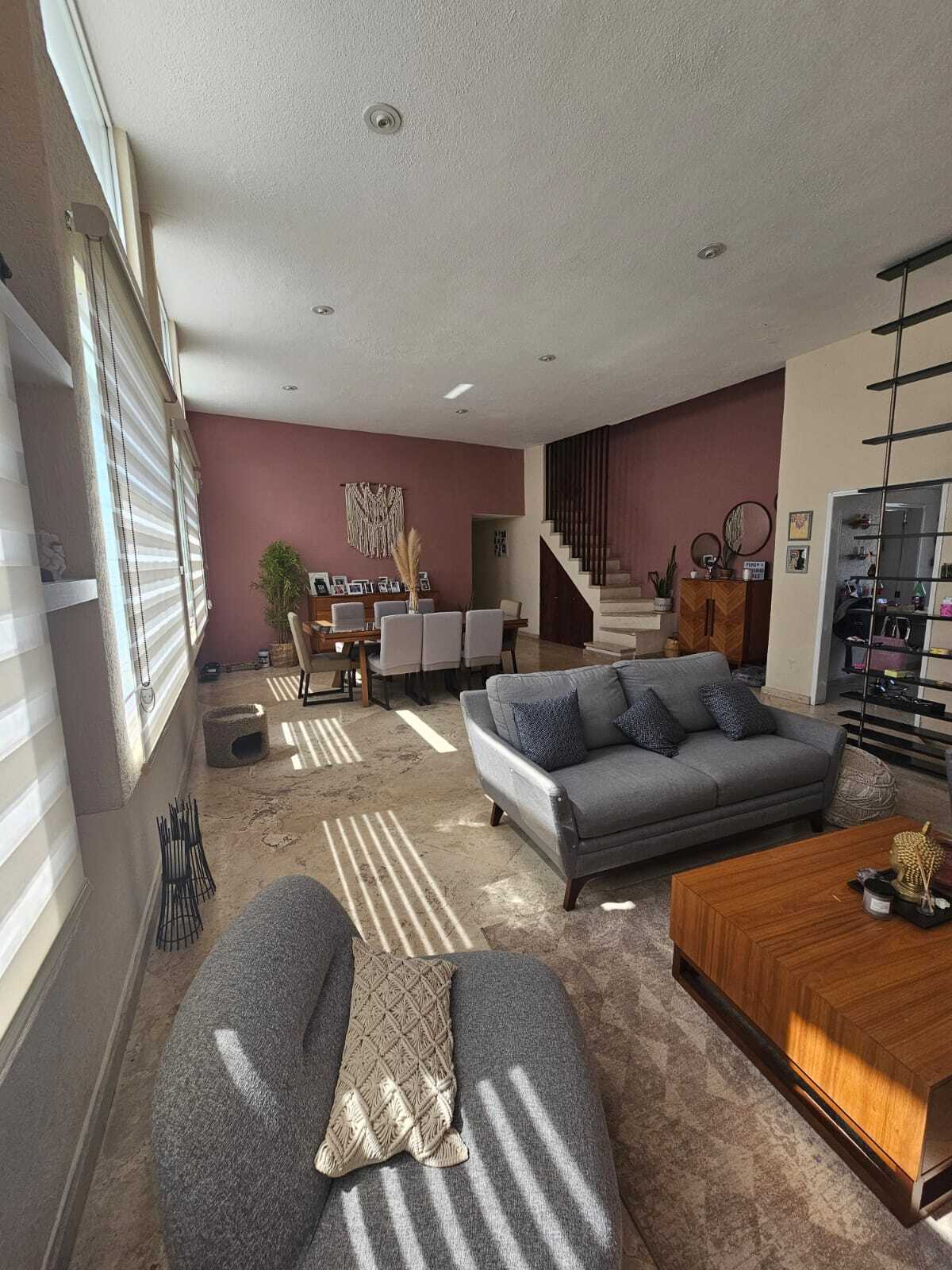 PB: cocina equipada cubierta de cuarzo, barra desayunador, área de lavado y cuarto de servicio; sala y comedor de doble altura, recámara principal doble altura con vestidor y baño, 2 recámaras secundarias con closet y comparten baño.