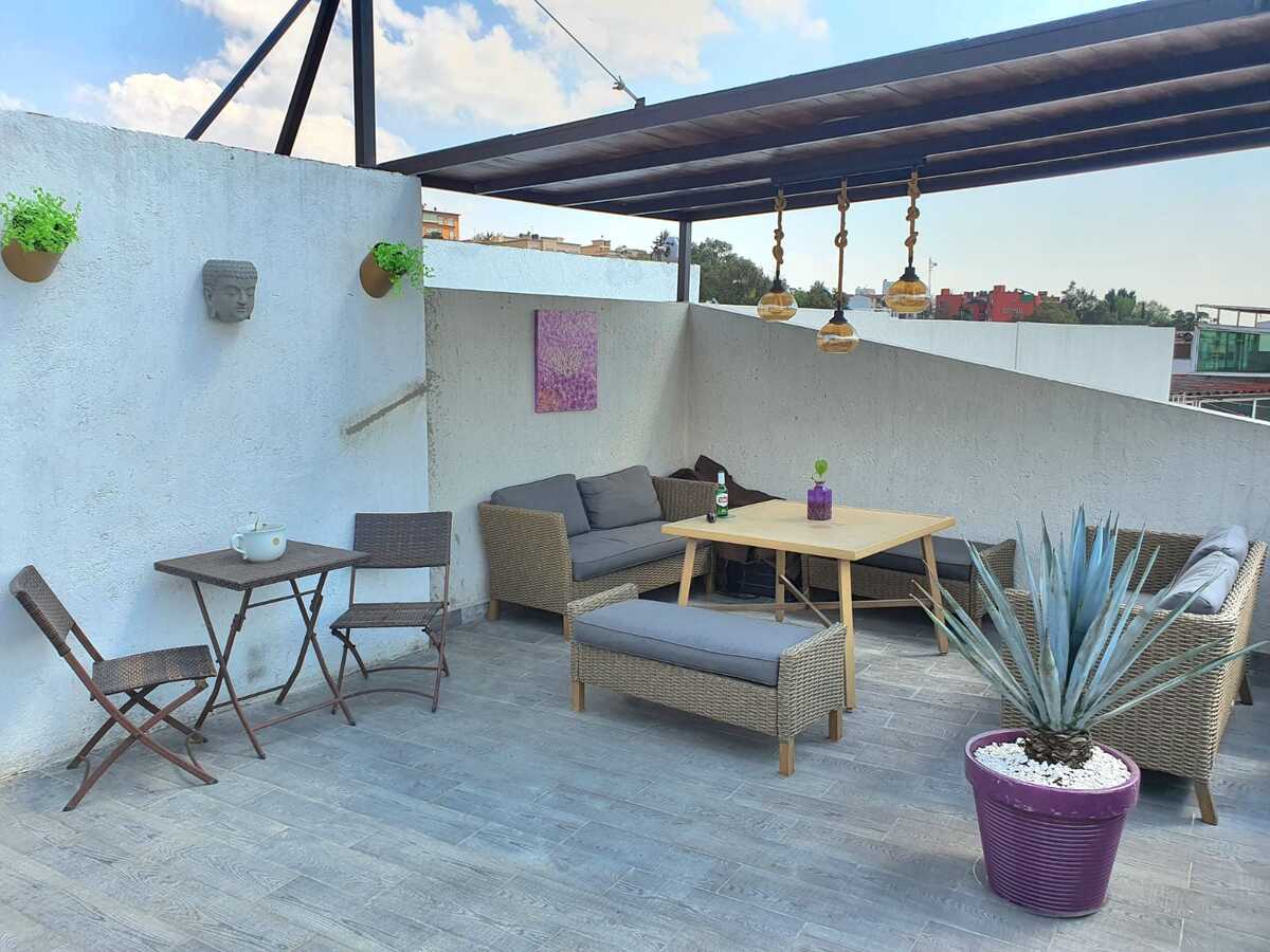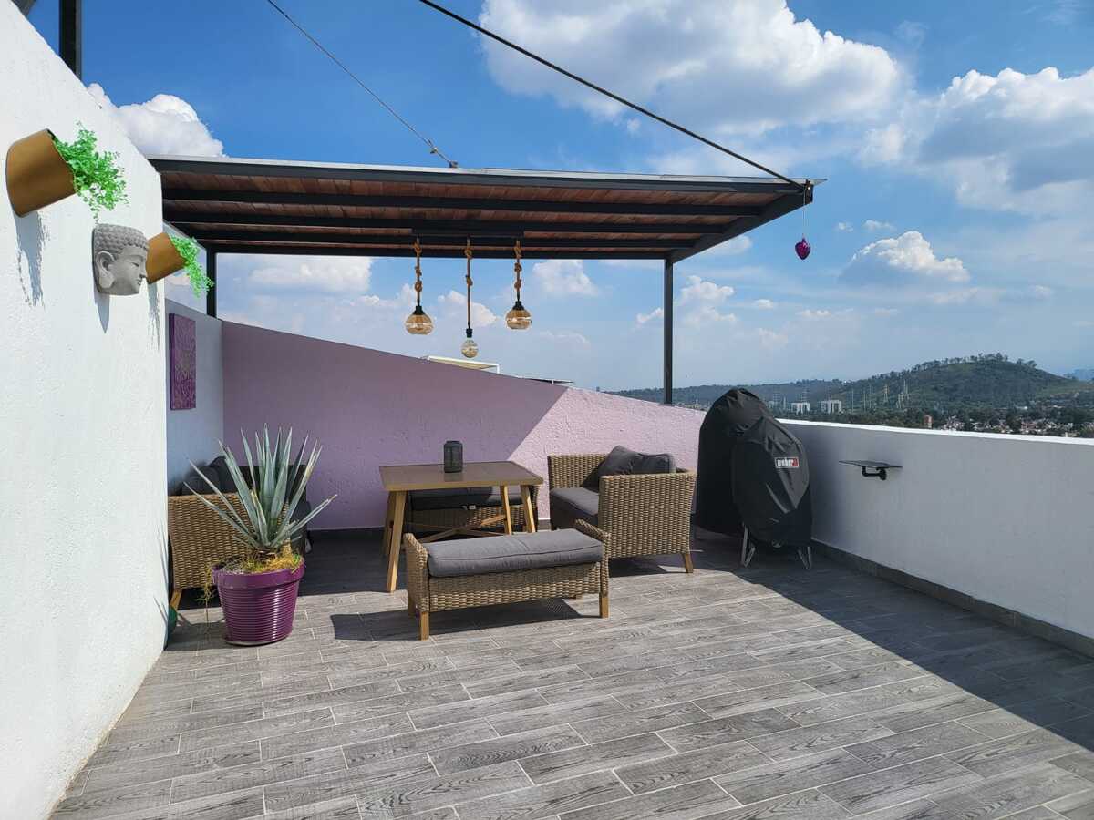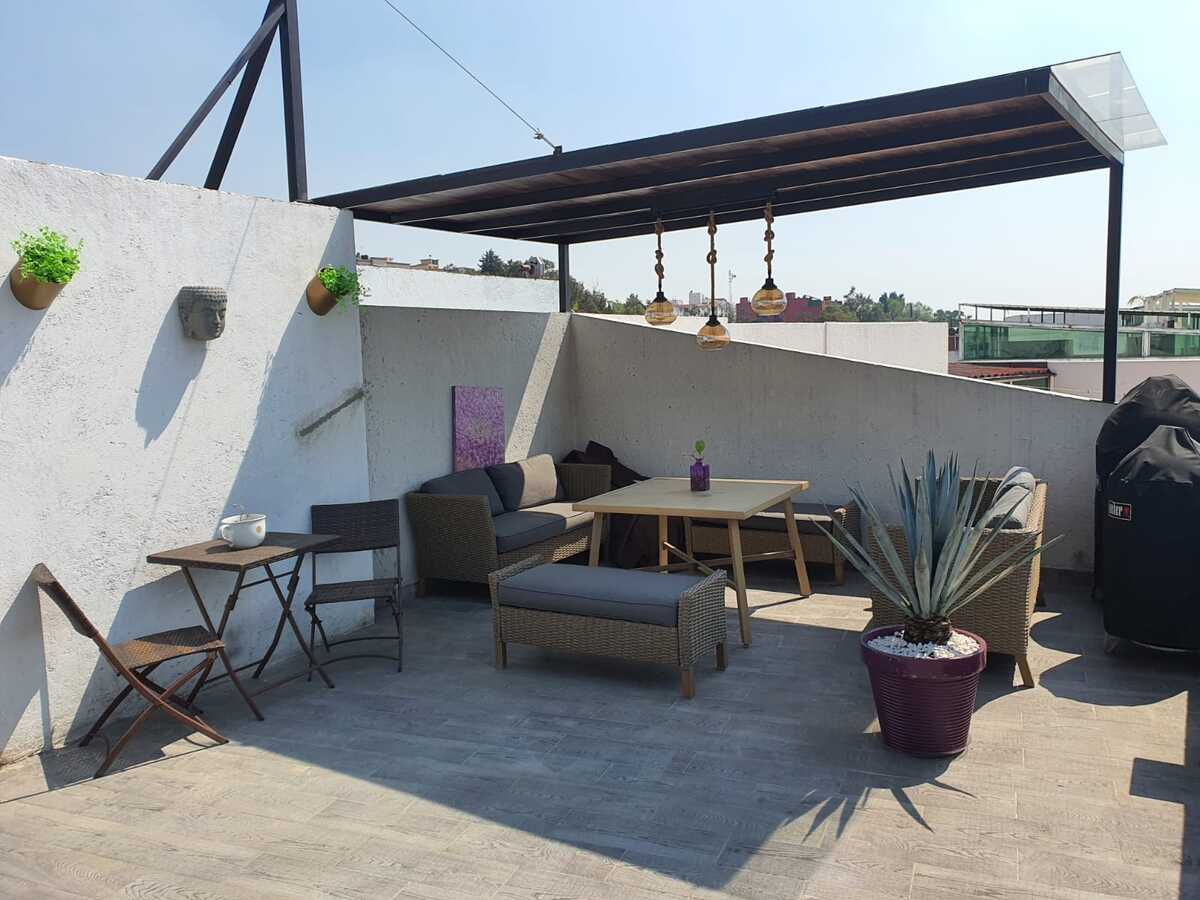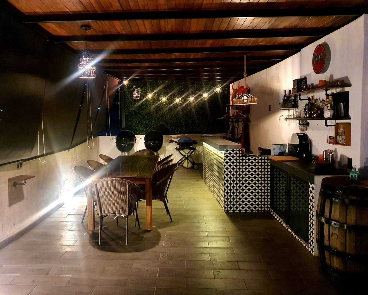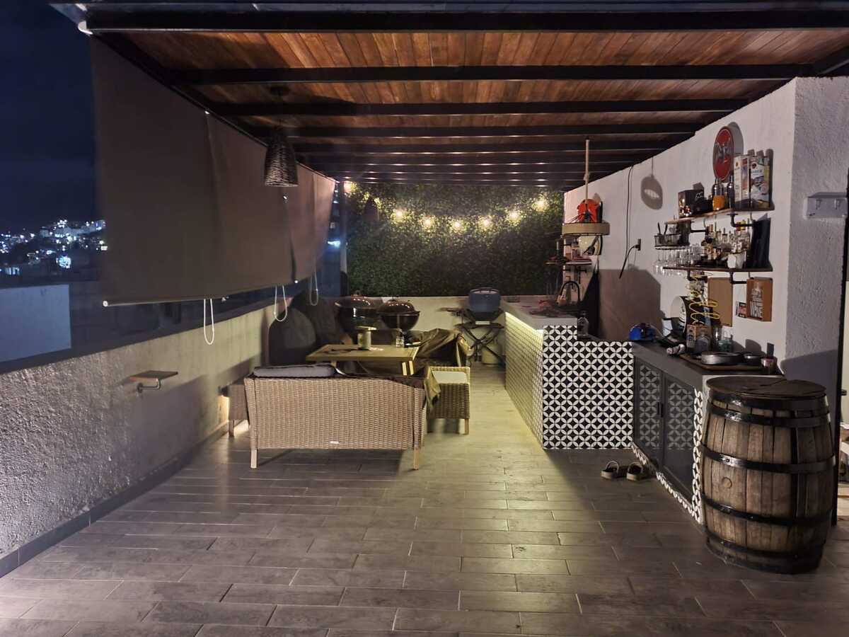 Roof garden con pérgola, barra de bar, tarja, área libre y otra pérgola, baño de visitas.